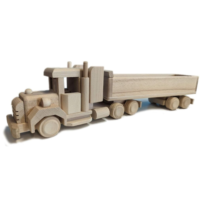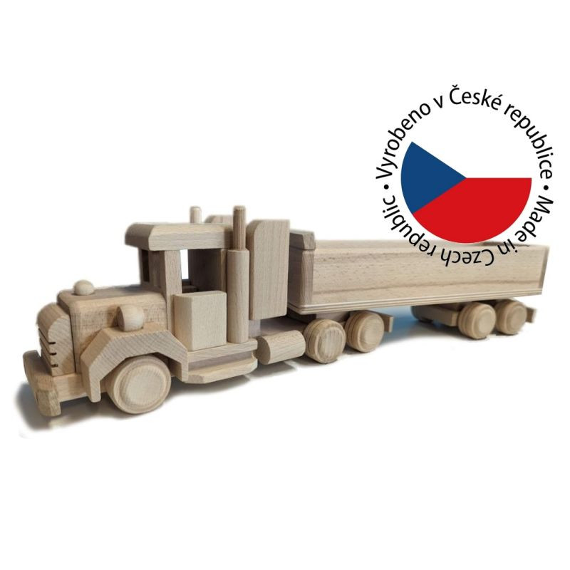 Kamión USA je vyrobený z masívneho bukového dreva, ktoré nie je povrchovo ošetrené. Dekoratívny kamión z masívneho bukového dreva Vám vydrží niekoľko generácií. Všetko je precízne spracované, drevo obrúsené, kolesá sa dajú otáčať, príves sa dá polohovať.