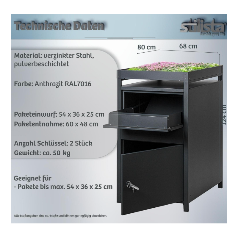 Vnesiete do svojho domova štýl aj praktickosť s poštovou schránkou STILISTA, ktorá ponúka nielen bezpečné uloženie balíkov, ale aj priestor pre vašu kreativitu vďaka strieške na rastliny. Váš vstupný priestor získa originálny vzhľad a už nikdy sa nebudete musieť zaoberať stratenými zásielkami.