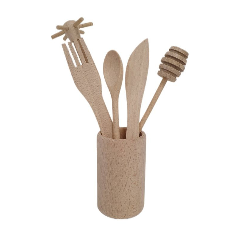 100% ekologický dřevěný příbor vyrobený z bukového přírodního dřeva. Nezbytná sada nástrojů pro skutečného kuchaře. Kuchyňská sestava je především solidně a pečlivě vyrobená. Mini sada je skvělý způsob, jak trávit čas s dítětem v kuchyni, naučit ho vařit a zároveň se bavit.
