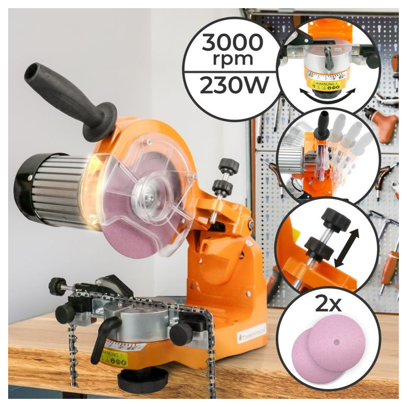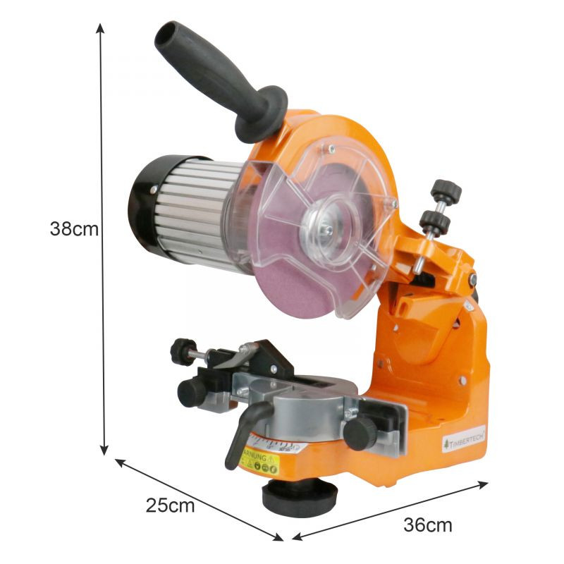 S týmto nástrojom je ostrenie čepeľou reťazových píl jednoduchšie. Výkonný indukčný motor s 3 000 otáčkami za minútu. Má dva rôzne brúsne kotúče, s ktorými možno pracovať. Vhodné pre bežné veľkosti reťazí: 1/4", 3/8", 3/4", 0,325", 0,404". Kompaktná veľkosť, ideálne na jednoduchú prepravu pri práci na rôznych miestach.
