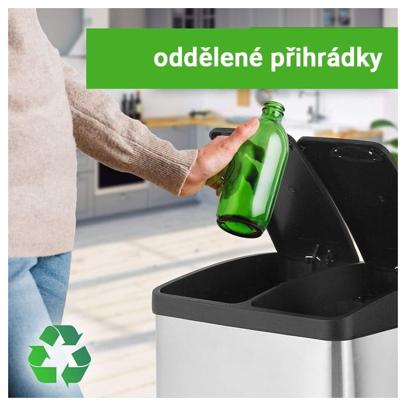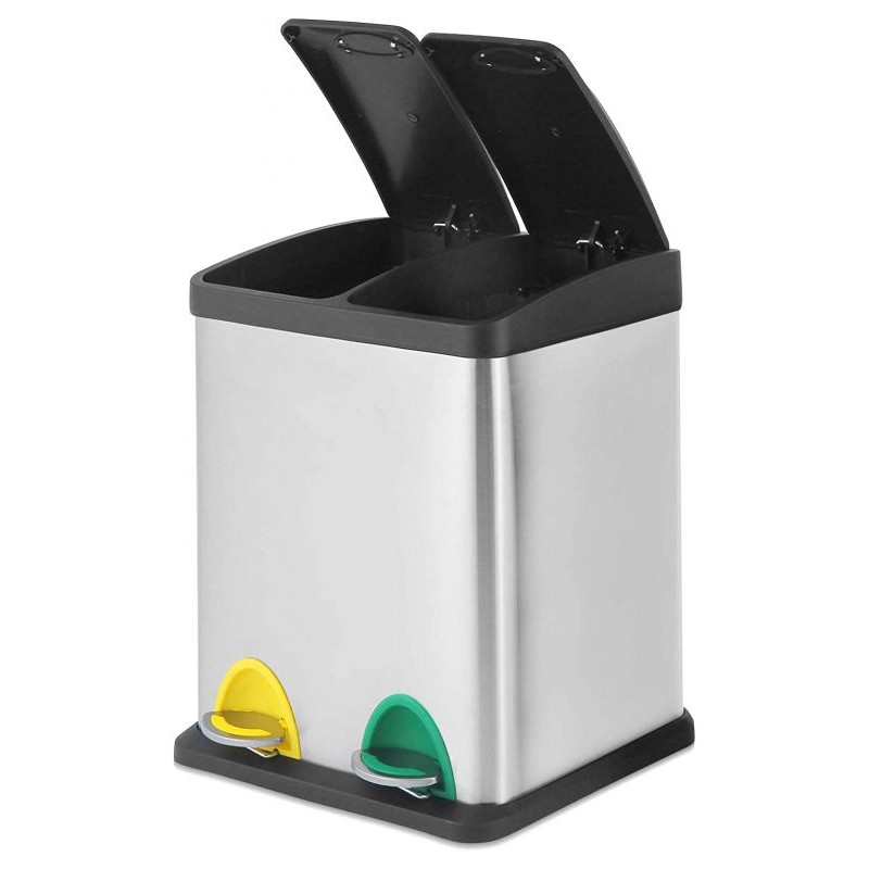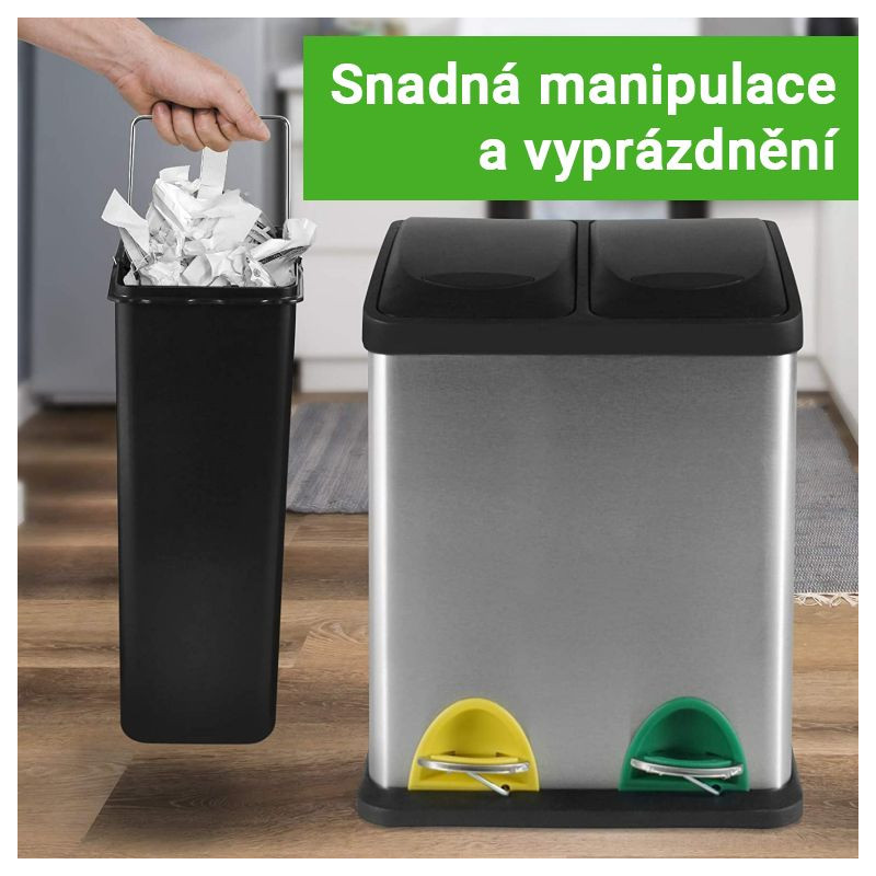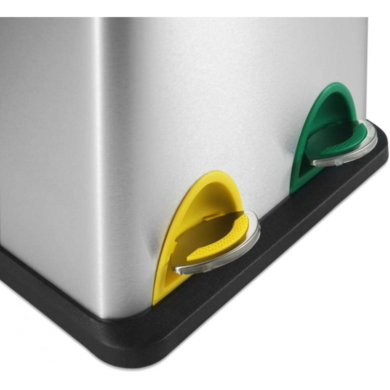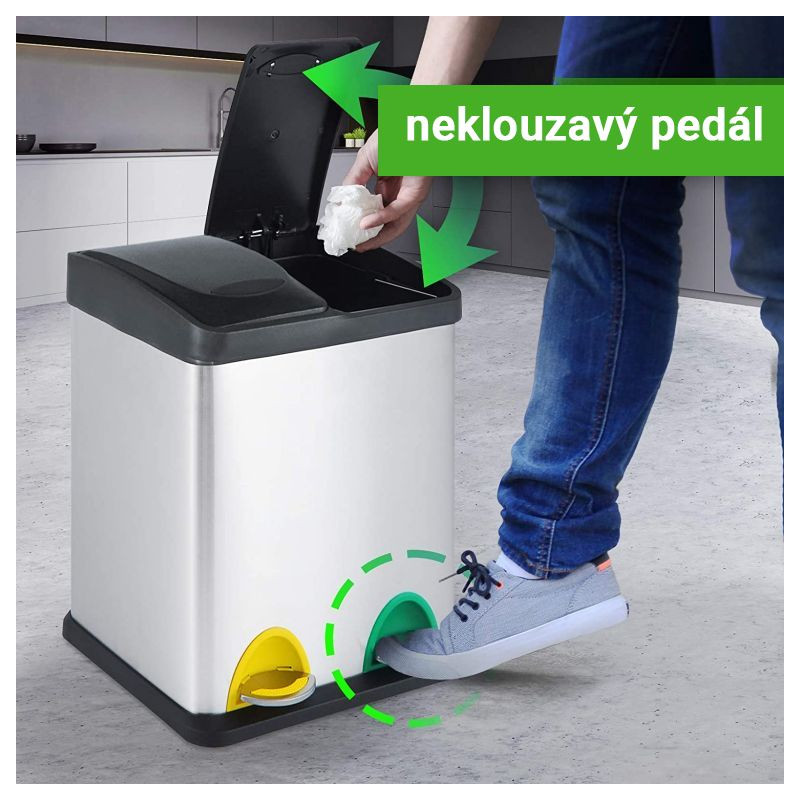 Tento pedálový odpadkový kôš má oddelené vnútorné vedierka, ktoré sú ideálne na triedenie rôznych druhov odpadu alebo recykláciu. Funkčnosť spolu s módnym dizajnom robí tento odpadkový kôš ideálnym na použitie v kuchyni, ale možno ho považovať aj za praktický doplnok do kúpeľne, spálne alebo kancelárskych priestorov. Tesne uzavreté veko nášho triediča odpadu sa otvára pomocou farebných pedálov a umožňuje ľahký prístup k vybratiu a vyprázdneniu odpadkov z vnútorných vedier. Odpadkový kôš má stabilnú protišmykovú základňu, ktorá chráni povrch podlahy, a tiež praktické madlo na zadnej strane, ktoré je vhodné na ľahký transport celého predmetu.