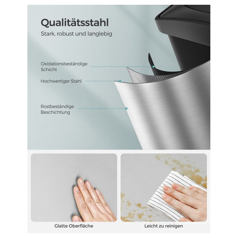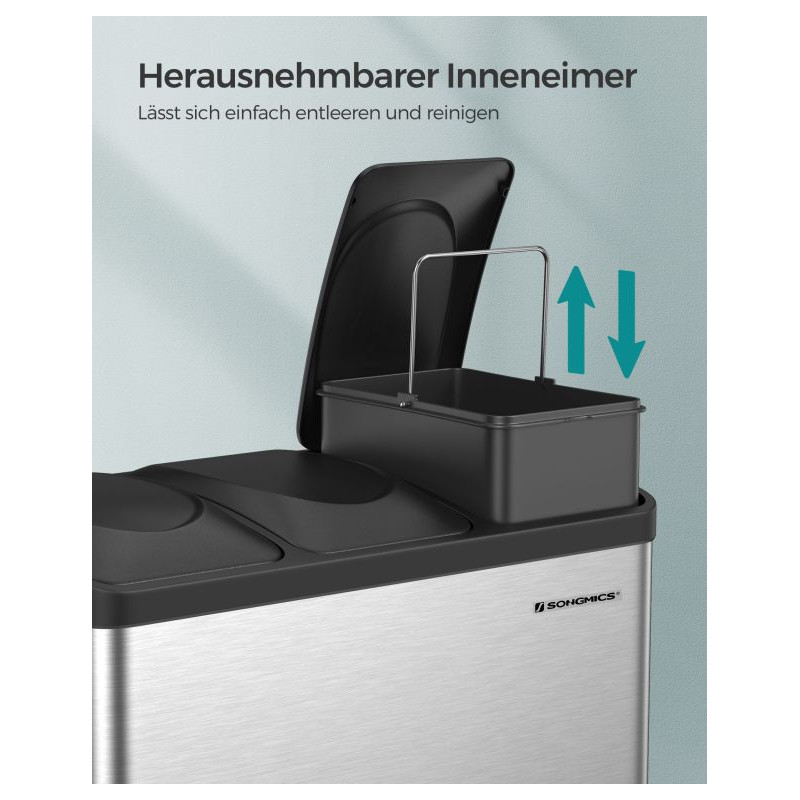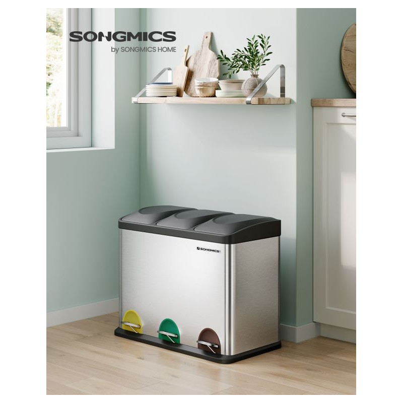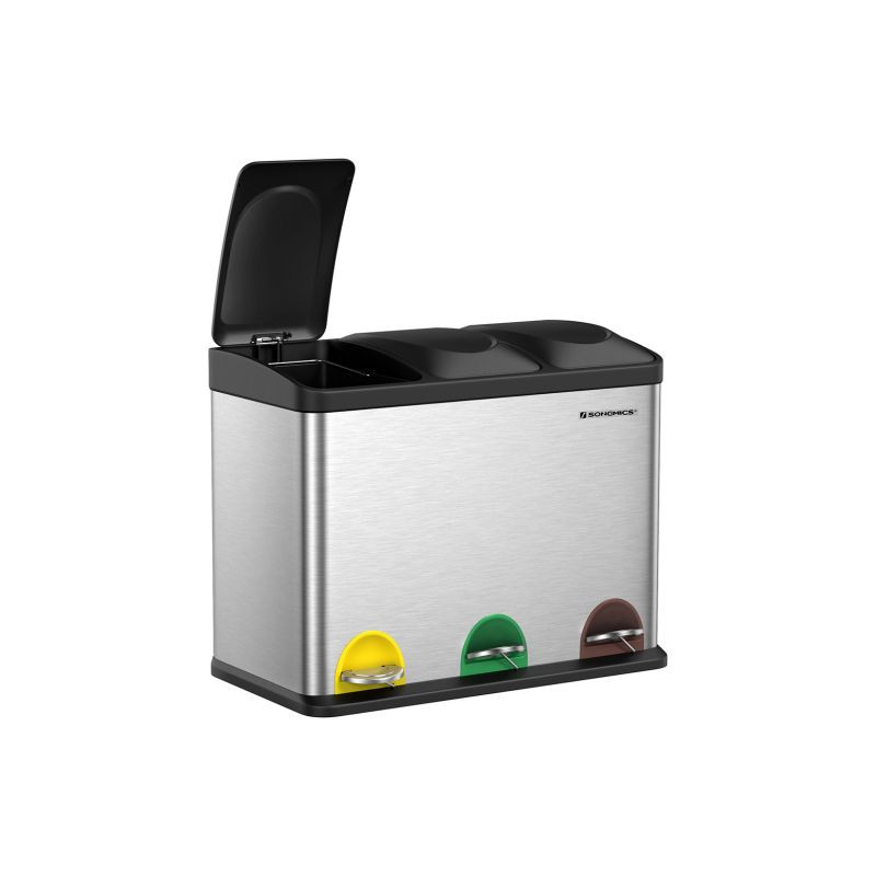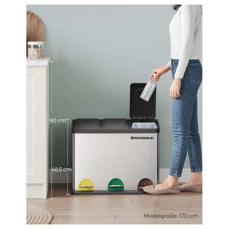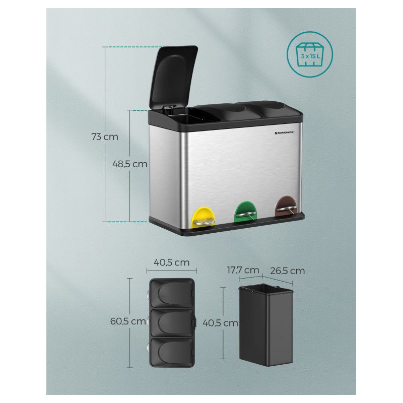 Celkový objem koša je 45 litrov, rozdelených do troch vyberateľných nádob po 15 litroch. Vďaka praktickým držadlám je vysypanie a čistenie rýchle a bezproblémové. Tesniace veká spoľahlivo bránia úniku pachov, zatiaľ čo pevná nerezová konštrukcia odoláva vlhkosti aj každodennému používaniu. Otváranie pomocou pedálov zaisťuje hygienickú obsluhu, takže sa koša nemusíte dotýkať rukami. Rozmery výrobku sú 59,3 × 30,2 × 46,7 cm a pri otvorení veka dosahuje výšku 72 cm.