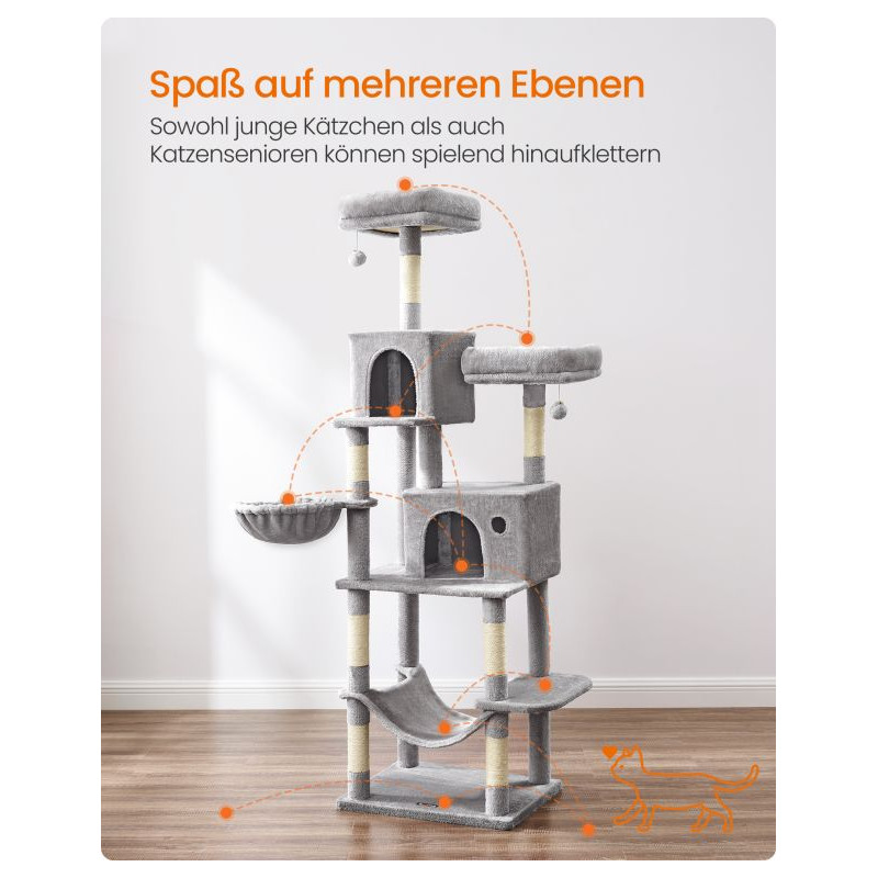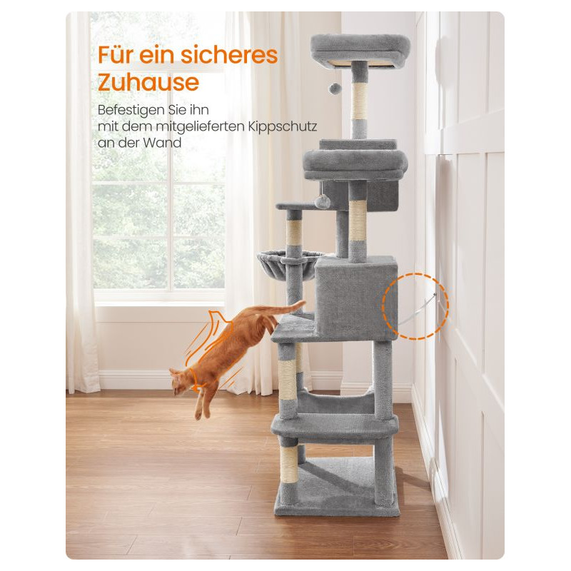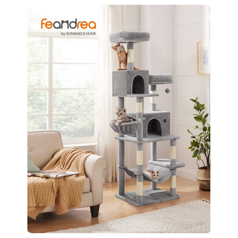Vytvorte svojmu domácemu maznáčikovi raj priamo doma. Tento stromček pre mačky ponúka všetko, čo mačka potrebuje – lezenie, odpočinok a bezpečné úkryty. Mäkké postele a priestranná hojdačka sú ideálne na leňošenie, zatiaľ čo škrabadlá chránia váš nábytok.