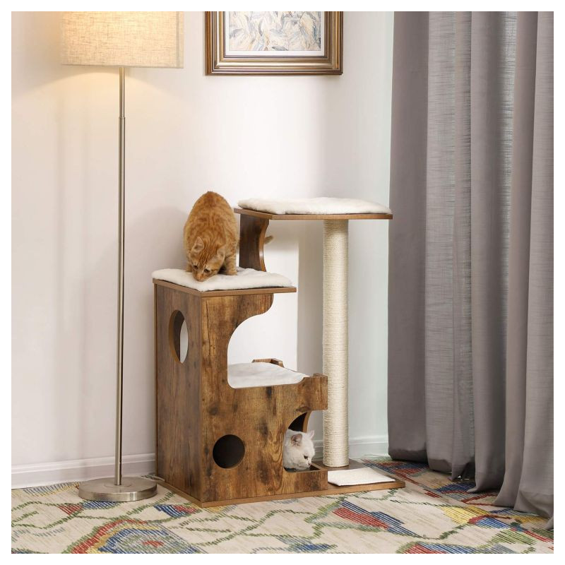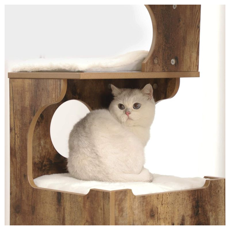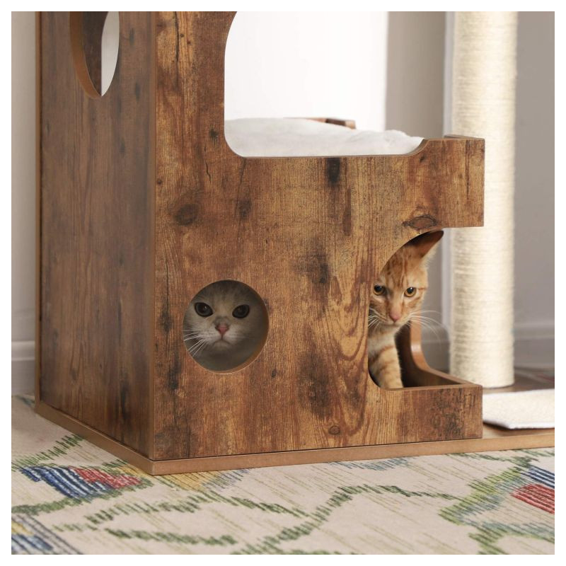Unikátny vintage vzhľad v kombinácii s mäkkými bielymi vankúšikmi prinesie do vášho domova útulnú atmosféru horskej chaty. Vaša mačka si zamiluje pohodlie a pokoj v priestrannom domčeku aj na vyvýšených plošinách, kde môže v pokoji odpočívať a pozorovať okolie.