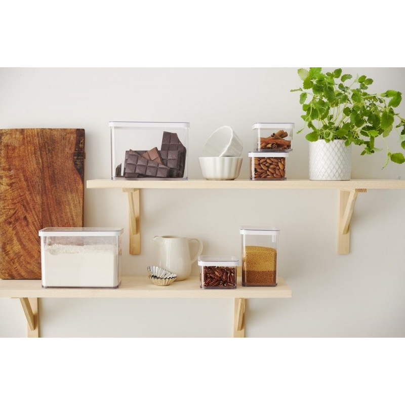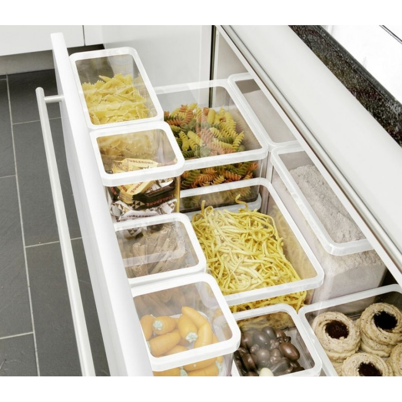 Sú plne transparentné, so silikónovým tesnením vo veku. Zaisťujú čerstvosť skladovaných produktov a chránia pred vonkajšími vplyvmi a vlhkosťou. Materiál neobsahuje BPA a je schválený pre styk s potravinami. Vhodné do umývačky, chladničky či mrazničky.