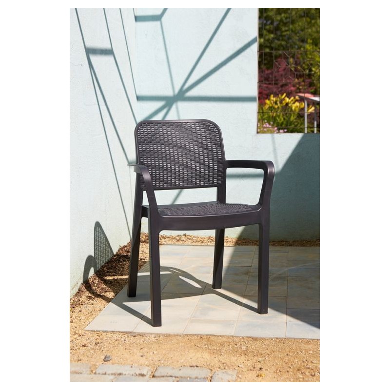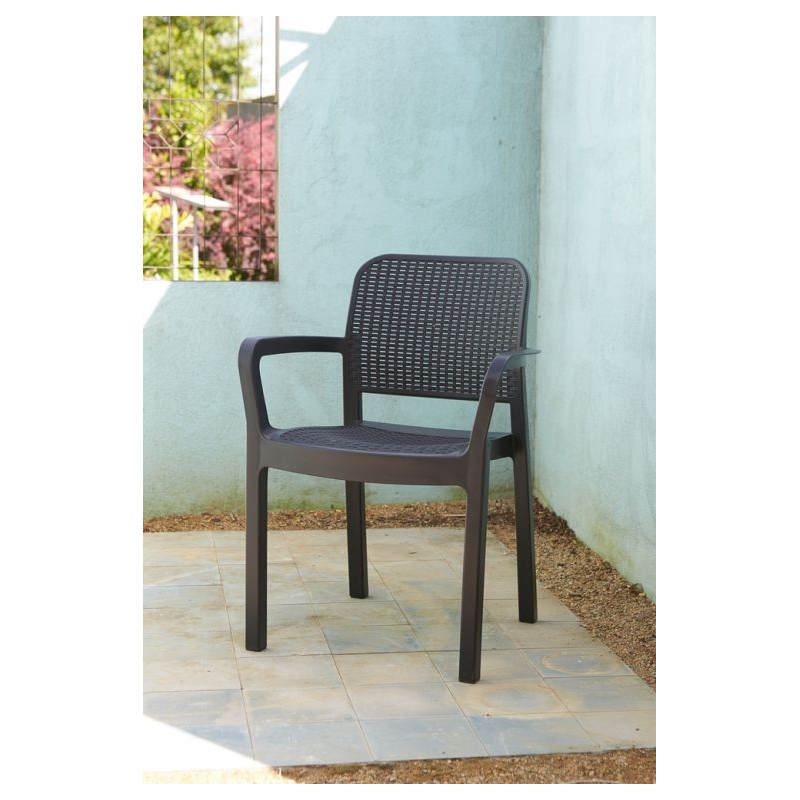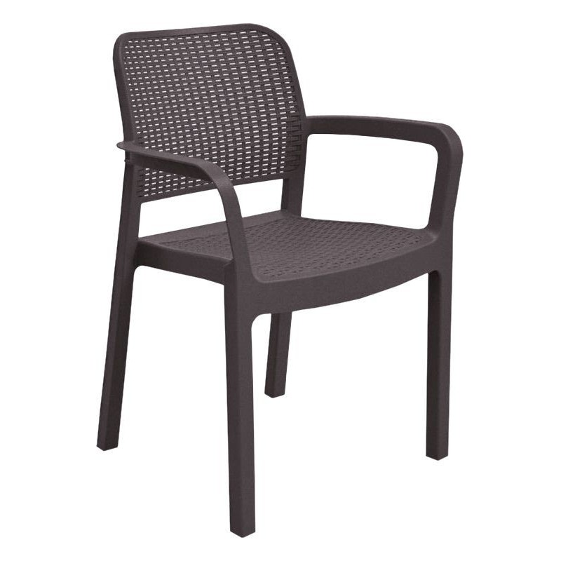 Záhradná plastová stolička v hnedej farbe. Moderný dizajn, ľahká údržba, vysoká odolnosť.
