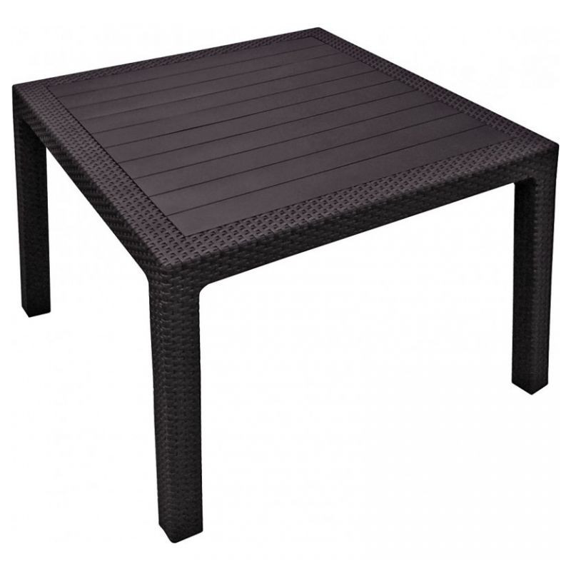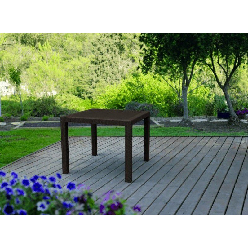 Štvorcový plastový stôl v hnedej farbe (vzor - imitácia ratanu). Jednoduchá údržba. Technické údaje: plastový stôl, farba: hnedá, rozmer: 95 x 95 x 75 cm, výrobca: Keter, hmotnosť: 8,5 kg, Obsah balenia: 1x záhradný stôl, rozmer balenia: 95 x 95 x 9 cm