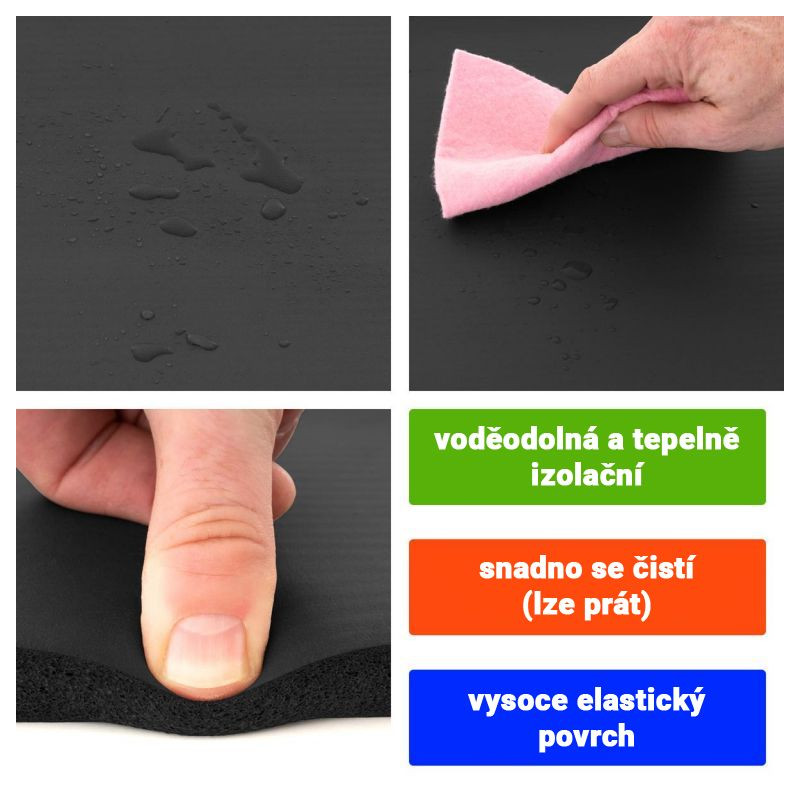 Fitness podložka je odolná proti roztrhnutiu a pošmyknutiu, je tiež vodeodolná (umývateľná) a tepelne izolačná, preto je vhodná aj na kempovanie. Okrem toho tlmí nárazy, takže je šetrná ku kĺbom. Bez zmäkčovadiel (bez ftalátov). Táto vysoko kvalitná gymnastická podložka z peny šetrnej k pokožke presvedčí výškou (hrúbkou) 15 mm. Po použití ju možno ľahko znova zrolovať.