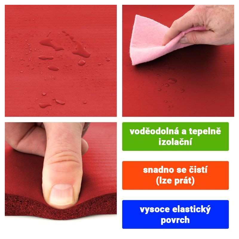 Fitness podložka je odolná proti roztrhnutiu a pošmyknutiu, je tiež vodeodolná (umývateľná) a tepelne izolačná, preto je vhodná aj na kempovanie. Okrem toho tlmí nárazy, takže je šetrná ku kĺbom. Bez zmäkčovadiel (bez ftalátov). Táto vysoko kvalitná gymnastická podložka z peny šetrnej k pokožke presvedčí výškou (hrúbkou) 15 mm. Po použití ju možno ľahko znova zrolovať.