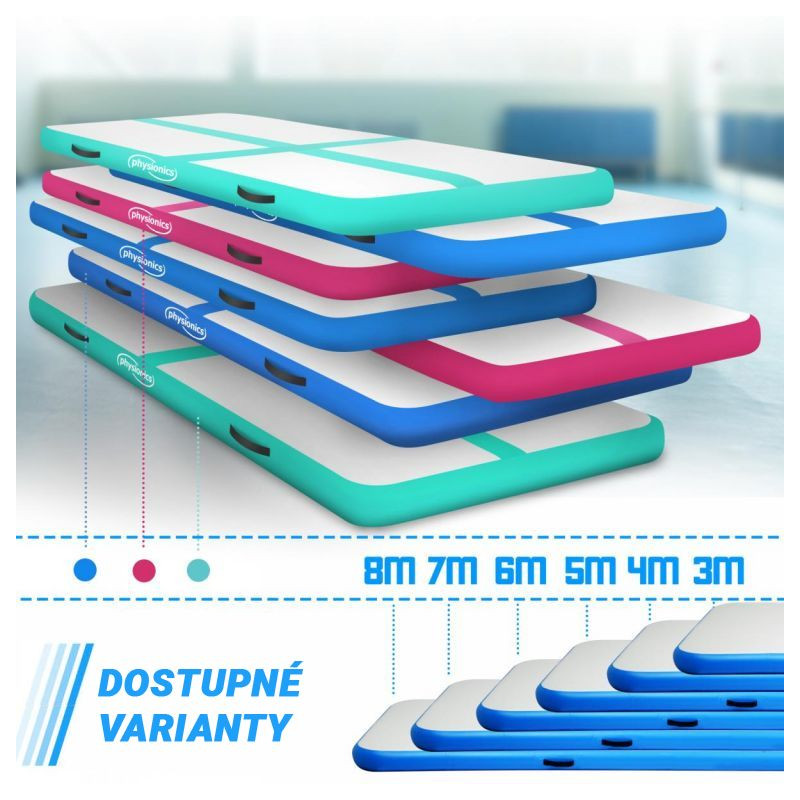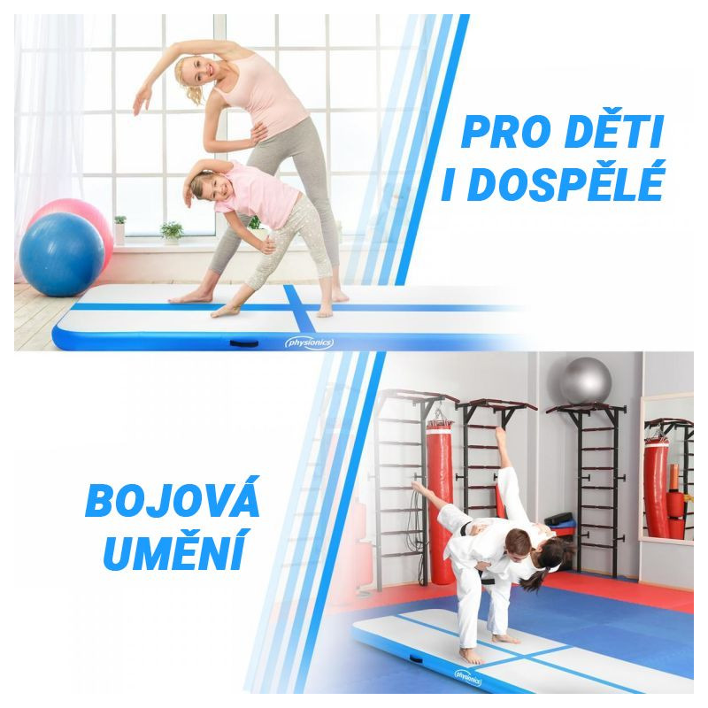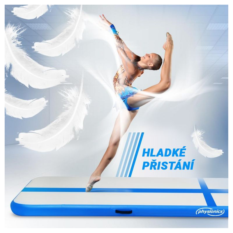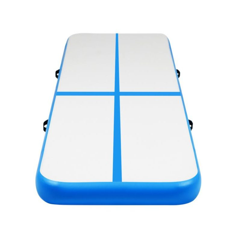 Naša gymnastická žinenka je 10 cm hrubá a je vyrobená z PVC plachty, dvojstenného materiálu, ktorého hlavnou vlastnosťou je udržať si tvar a stabilitu konštrukcie pri vonkajšom tlaku a nárazu. Tento komplet je vybavený elektrickou vzduchovou pumpou a sadou na opravu.