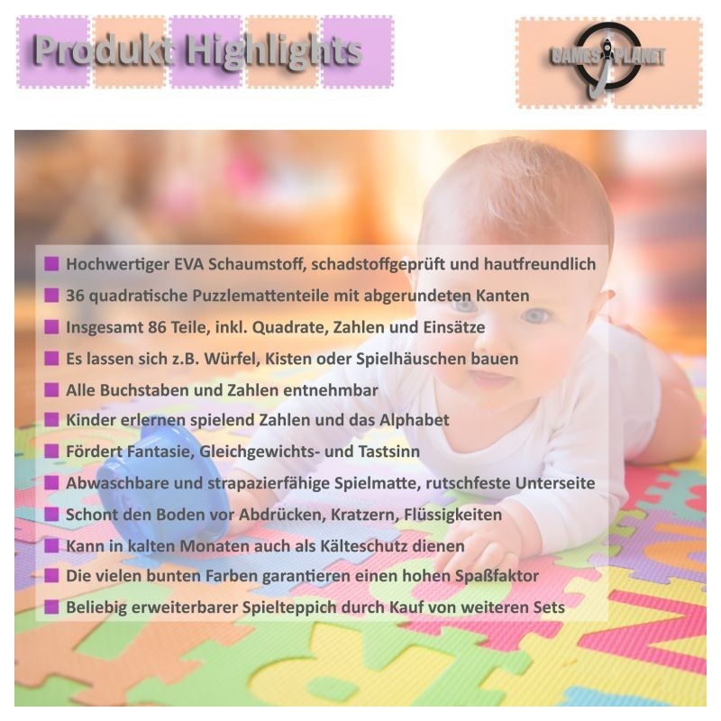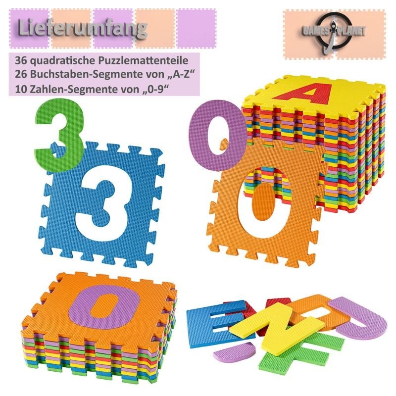 Táto podložka ponúka nekonečné možnosti hrania ako je stavanie kociek, krabíc, domčekov - fantázii sa medze nekladú. Zábavne sa s deťmi môžete učiť aj čísla a abecedu. Slúži zároveň ako ochrana na podlahy, skvele sa hodí na miesta bez kobercov. Podložka je umývateľná vodou, odolná, protišmyková, chráni podlahu pred stopami, poškriabaním, tekutinami a je vhodná aj ako ochrana proti chladu v chladných mesiacoch. Sada sa skladá z 36 štvorcových dielikov puzzle, 26 písmen od "A-Z" a 10 čísel od "0-9", celkovo 86 dielikov (vrátane štvorcov, číslic a vkladačiek).