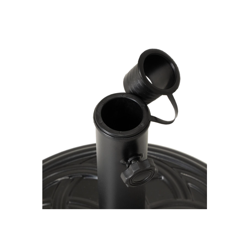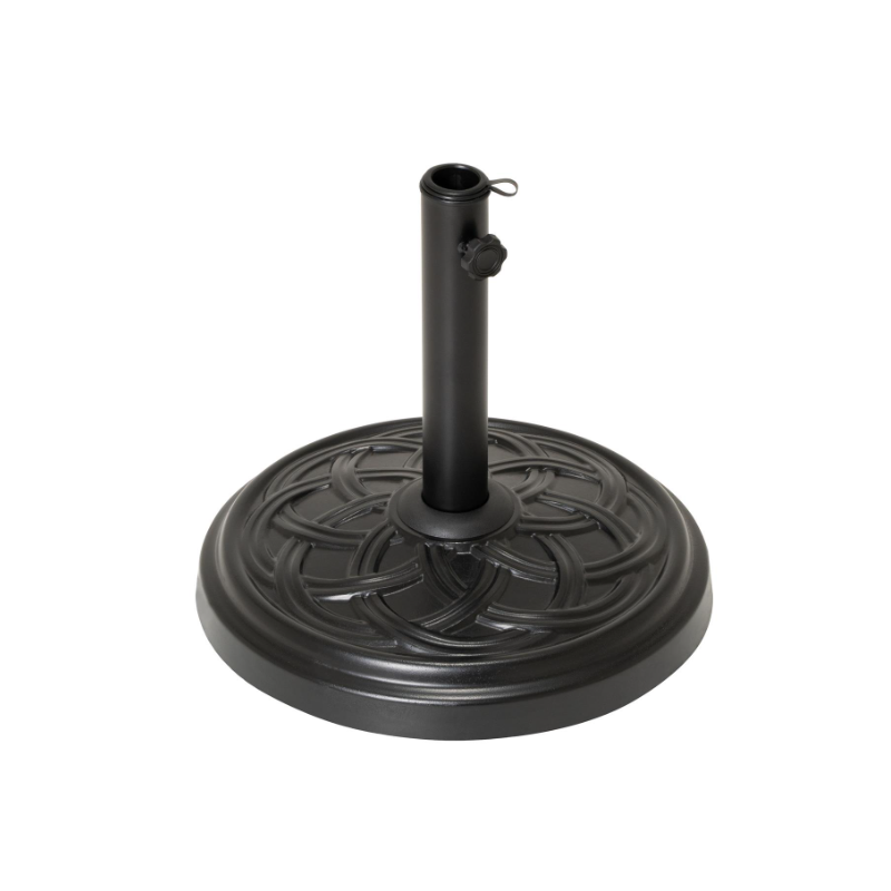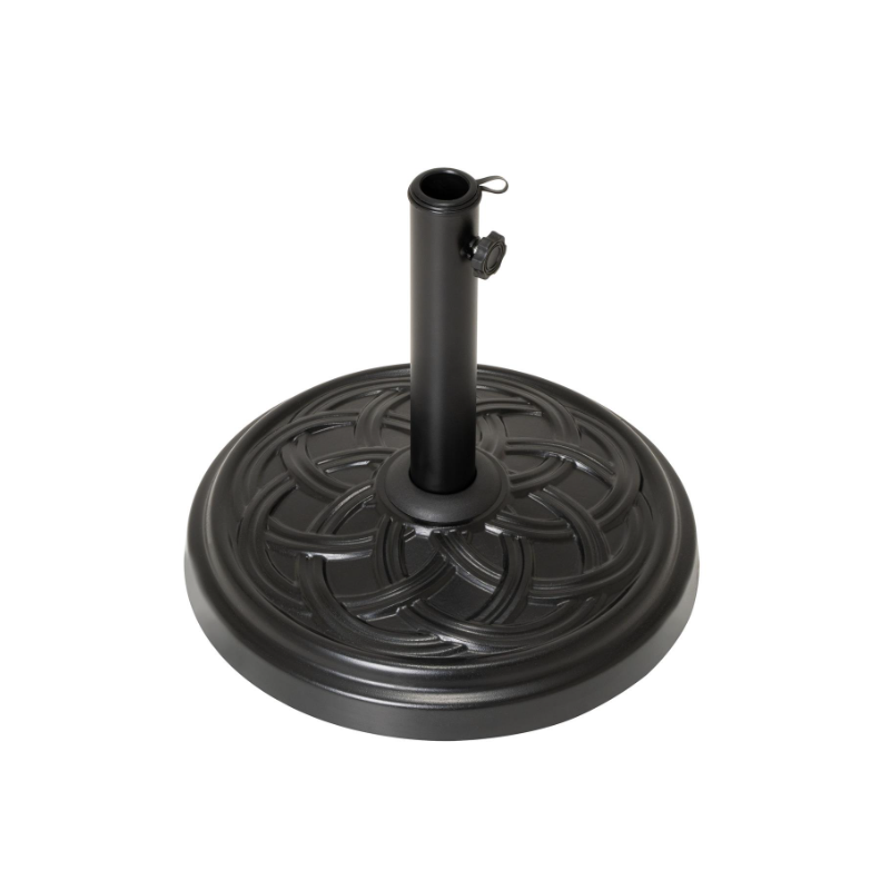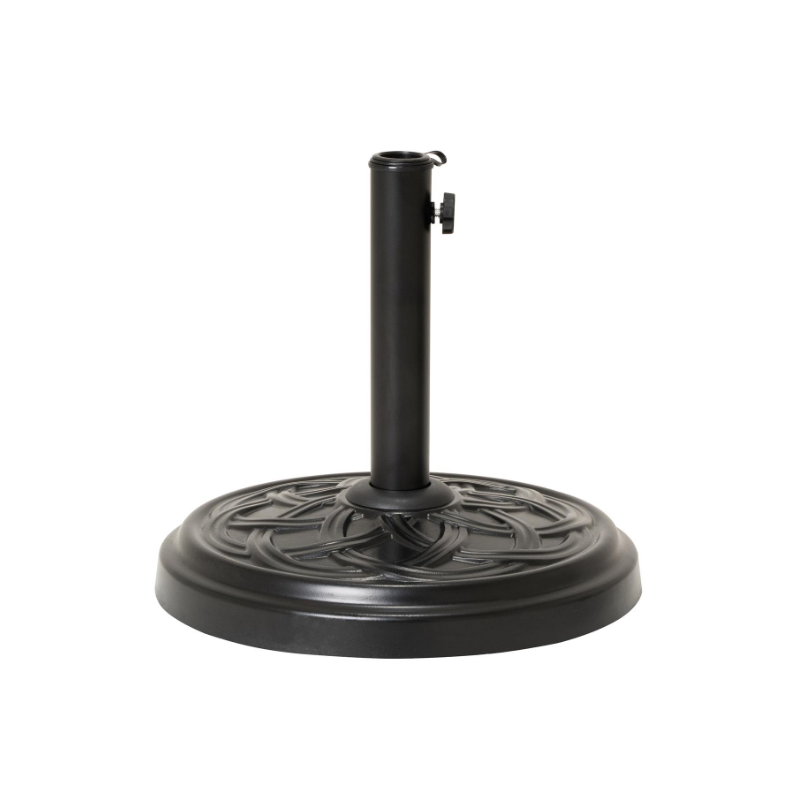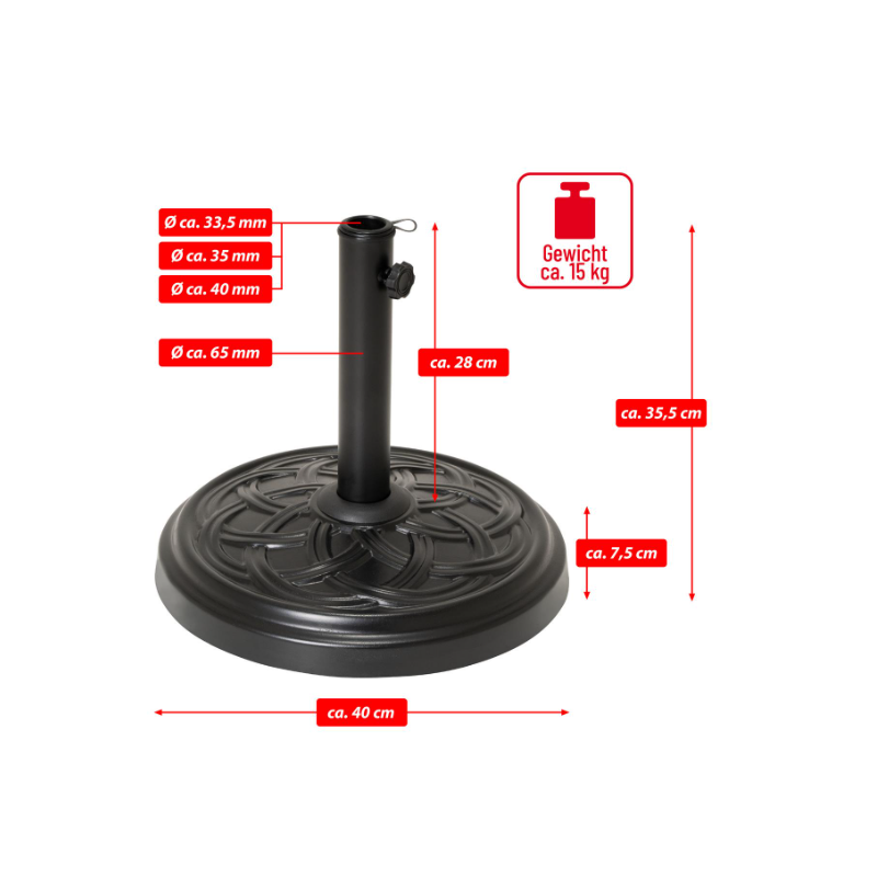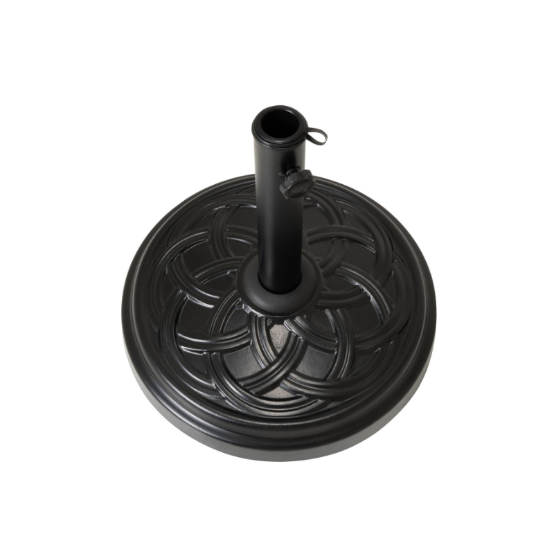 Tento robustný, 15 kg okrúhly podstavec slnečníka vyrobený z betónu plní nielen svoju funkciu bezpečnej podpory pre váš slnečník, ale aj dobre vyzerá a je tiež ľahký a praktický pri používaní. Stojan je potiahnutý načierno a má dekoratívny vzor. Vybavené aretačnou skrutkou, ktorá slnečník fixuje. Ideálne pre vašu terasu alebo balkón. Kruhový tanier má priemer cca 40 cm. Celková výška je cca 35,5 cm. Stojan je so svojimi 15 kg vhodný pre slnečníky do 2 m – nie pre konzolové slnečníky. Všimnite si aj naše ďalšie záhradné veci, ako sú slnečníky, stoly, skladacie stoličky, stohovacie stoličky, lehátka, lavičky z kovu, plastu alebo dreva.