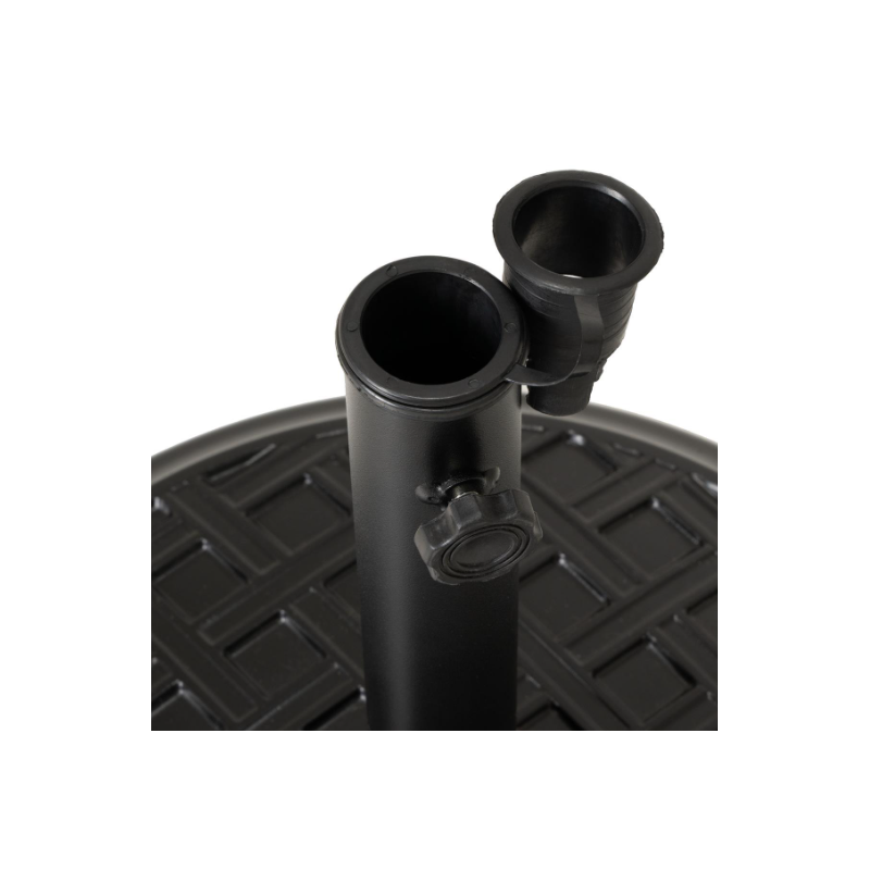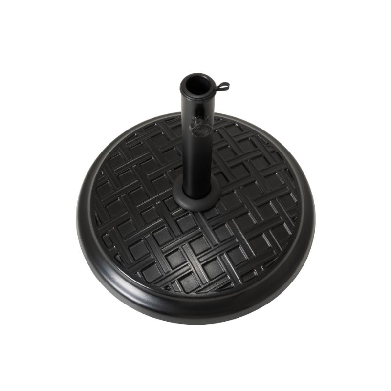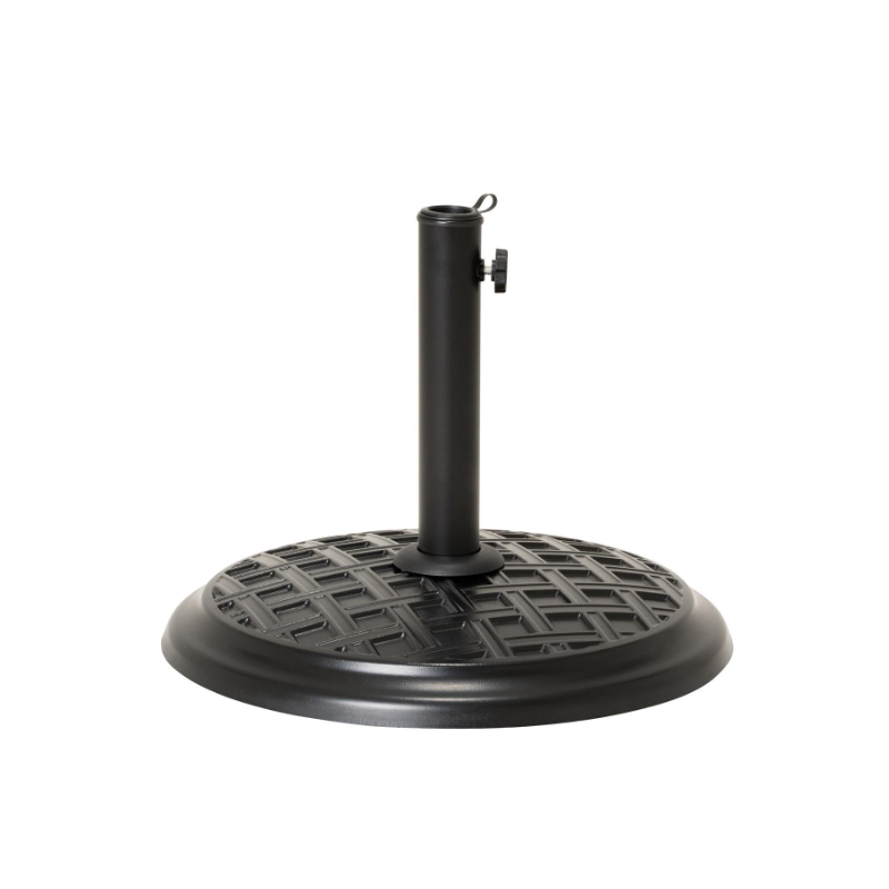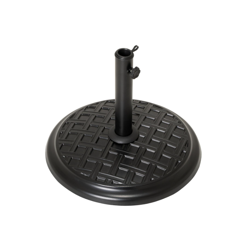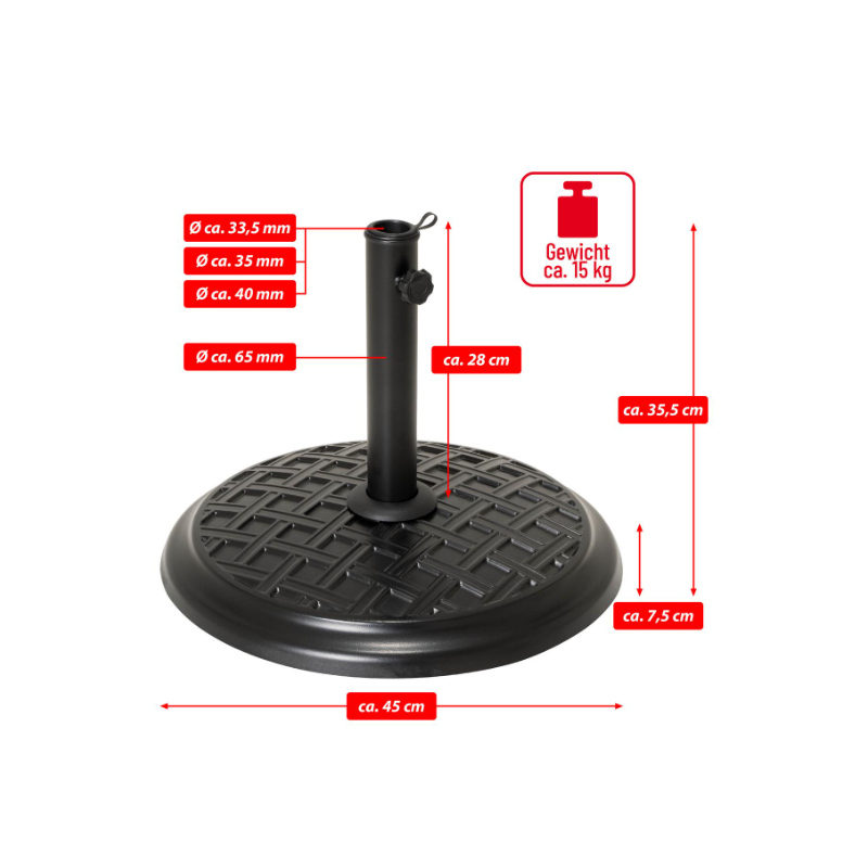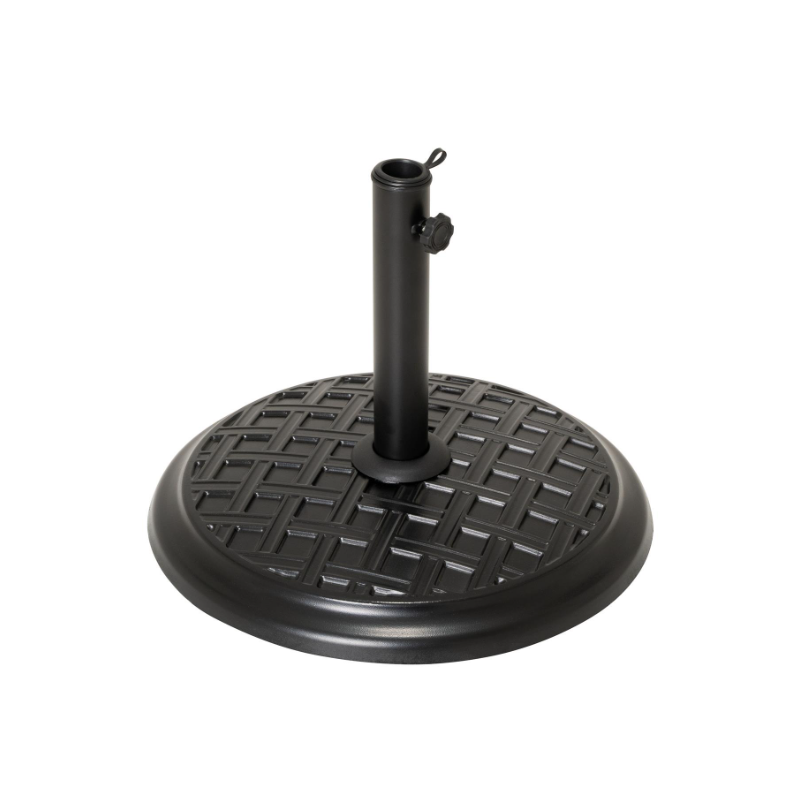 Tento robustný okrúhly podstavec slnečníka vyrobený z betónu plní nielen svoju funkciu bezpečného držiaka pre váš slnečník, ale aj dobre vyzerá a je tiež ľahký a praktický. Stojan je potiahnutý čiernou farbou a má ozdobný vzor. Vybavené aretačnou skrutkou, ktorá slnečník fixuje. Ideálne pre vašu terasu alebo balkón. Kruhový tanier má priemer cca 45 cm. Stojan je so svojimi 15 kg vhodný pre slnečníky do 2 m – nie pre konzolové slnečníky. Všimnite si aj naše ďalšie záhradné veci ako sú slnečníky, stoly, skladacie stoličky, stohovacie stoličky, lehátka, lavičky z kovu, plastu alebo dreva.