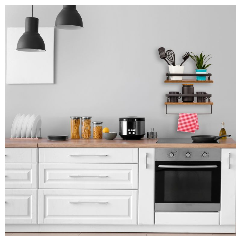 Sada 2 kusov nástenných políc dizajnovej rady "VOLATO DUO" je skutočnou perlou vo Vašom domove. Nielen vďaka rustikálnemu vzhľadu dreva v atraktívnom prevedení, ale aj vďaka dekoratívnemu kovaniu. Kovový rám umožňuje nielen stabilné pripevnenie na stenu, ale zároveň zabraňuje prípadnému pádu predmetov z police. Súčasťou dodávky je tiež ďalší voliteľný kovový držiak, ktorý uvítate na zavesenie utierky alebo ako držiak kuchynských pomôcok.