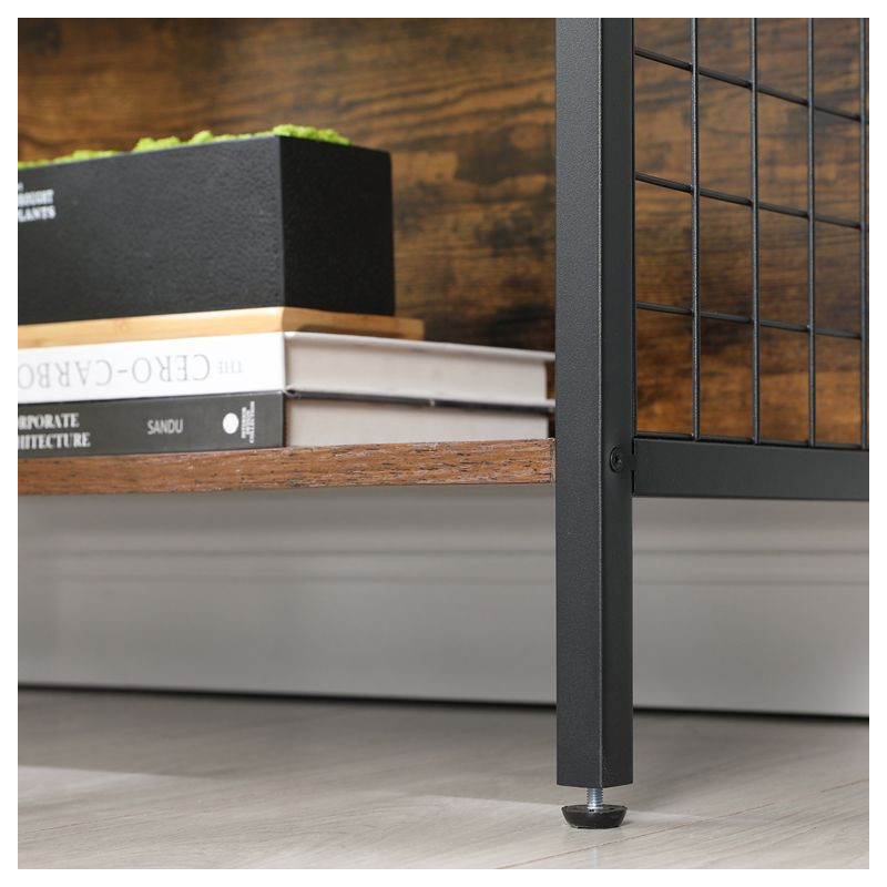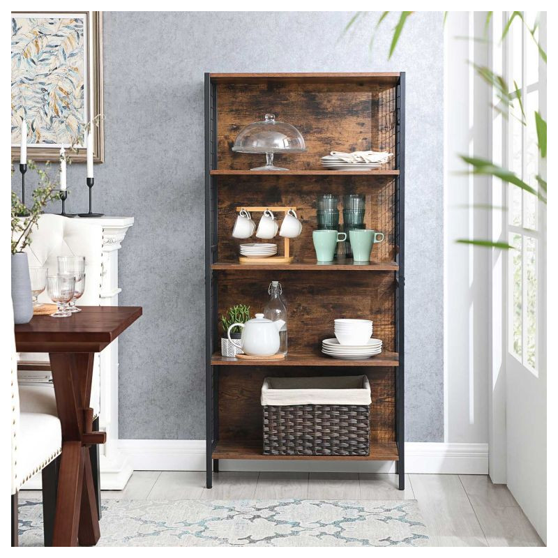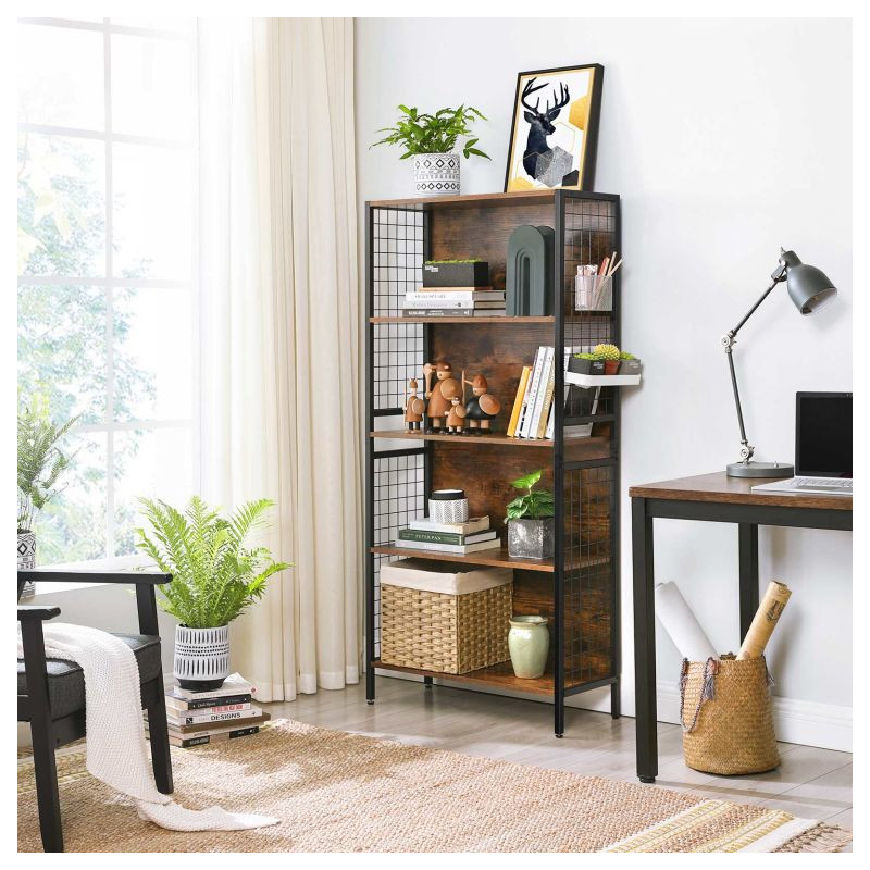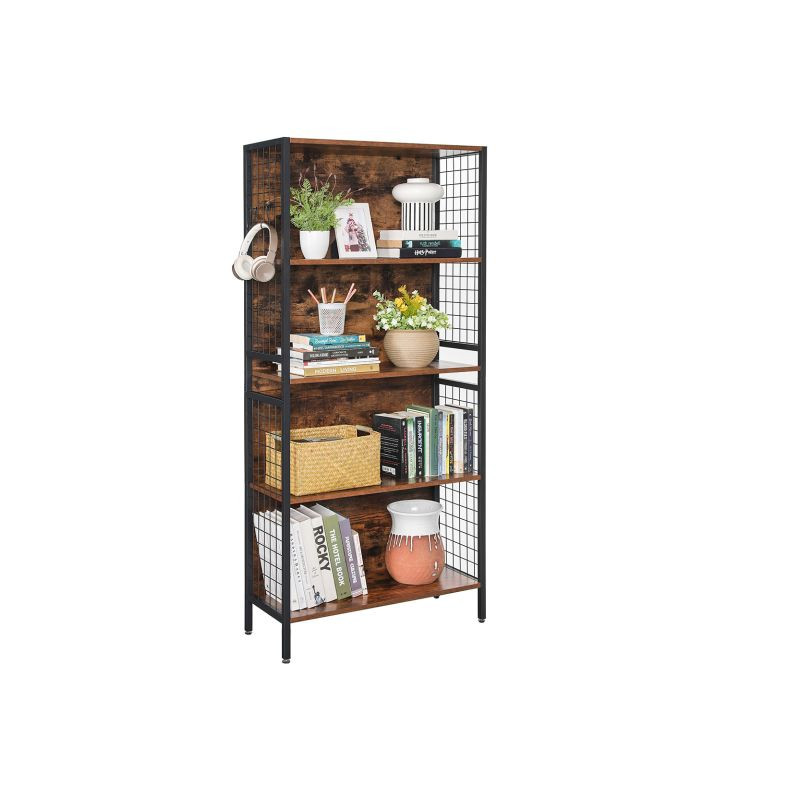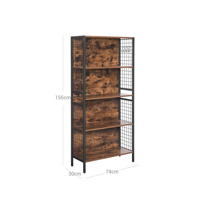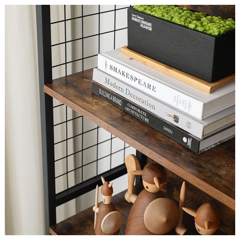 Vytvorte si útulný kútik s touto knižnicou, ktorá kombinuje moderný čierny kov s teplými odtieňmi dreva. Praktické háčiky na bočných mriežkach vám umožnia mať všetko, čo potrebujete, po ruke. Ideálne pre knihy, dekorácie a drobnosti, ktoré nechcete stratiť z dohľadu.