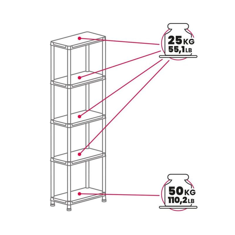 Regál je navrhnutý pre jednoduchú montáž a stabilitu. Spodná polica unesie až 50 kg, ostatné po 25 kg. Certifikácia TÜV SÜD garantuje vysokú bezpečnosť. Povrch sa ľahko čistí a plast je odolný voči vlhkosti aj mechanickému poškodeniu.