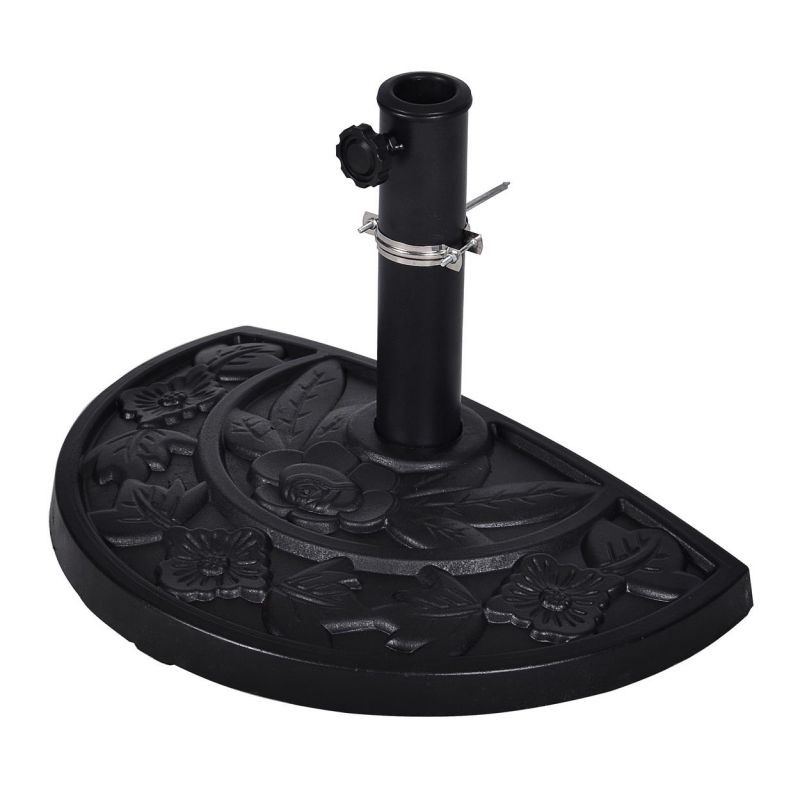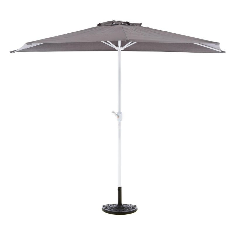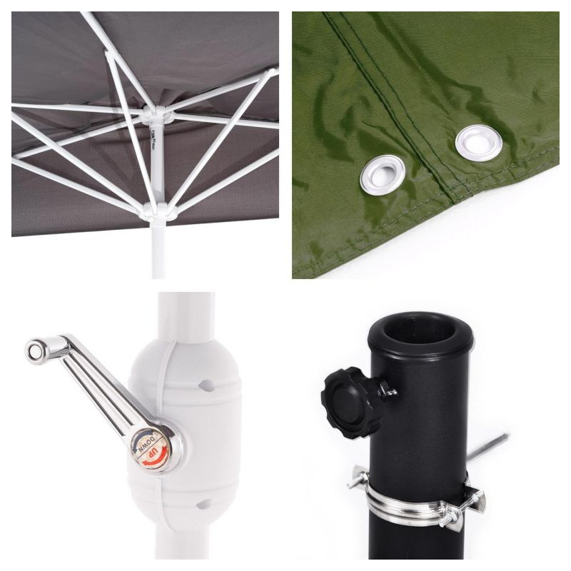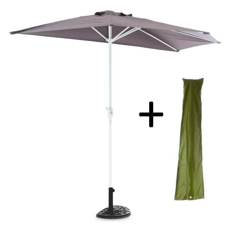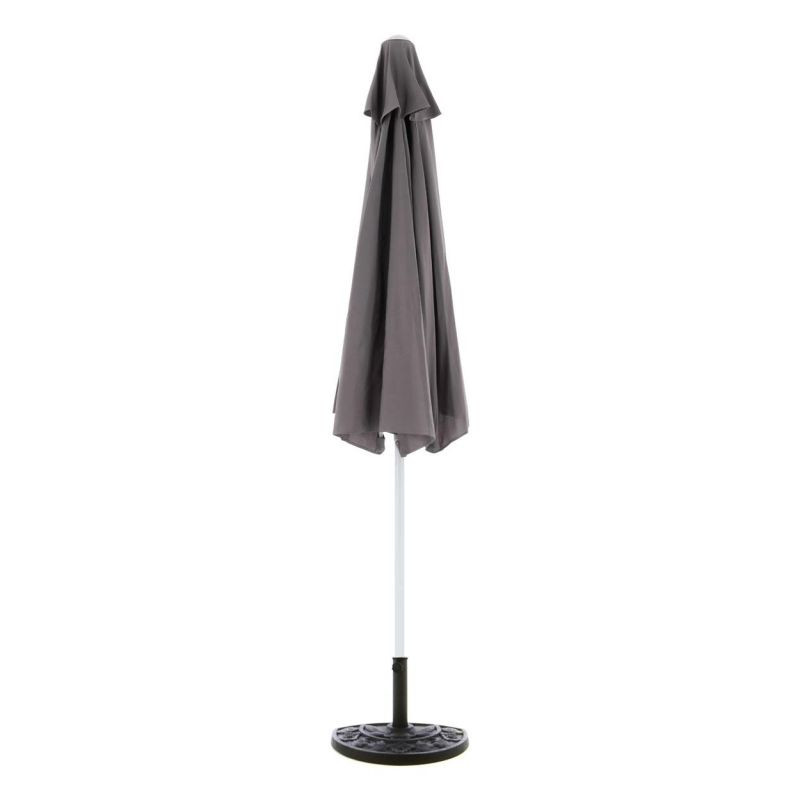 Slnečník zložte až keď je úplne suchý, aby ste zabránili vzniku škvŕn a plesní a vložte ho do obalu. Nepoužívajte agresívne čistiace prostriedky ani odmasťovacie čistidlá, pretože môžu poškodiť impregnáciu alebo napadnúť povlak na slnečníku. Hrubé nečistoty odstráňte mäkkou kefkou. Používajte len vlažnú vodu a jemné mydlá. Polkruhový stojan vyrobený z polyresinu v ušľachtilom liatom vzhľade môže byť pre väčšiu stabilitu pripevnený k stene pomocou svorky. Stojan na slnečník váži približne 9 kg a má priemer približne 49 cm. Polyesterový ochranný kryt na slnečník je nepremokavý a chráni pred škodlivými vplyvmi počasia. Vďaka kovovým okám na leme môže byť slnečník stiahnutý a bezpečne zložený.