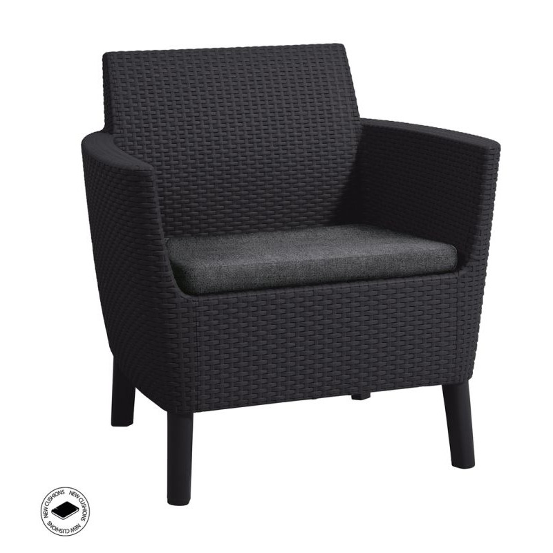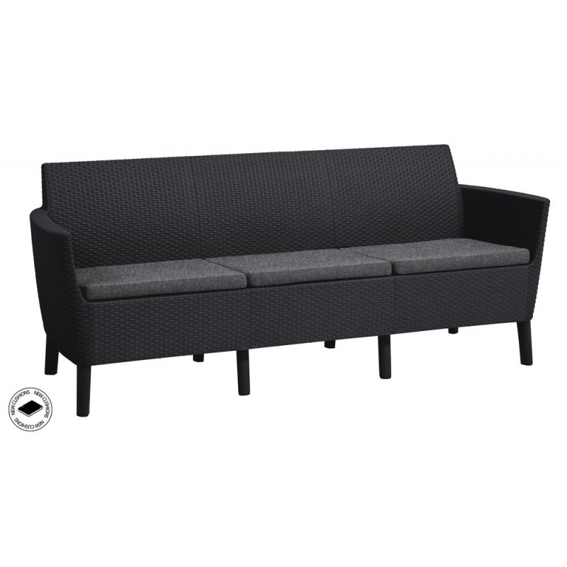 Salemo 3 seater je úplná novinka na trhu, súprava ktorá skvele vynikne v modernom aj retro štýle bývania. Jedná sa o elegantný set v imitácii ratanu, skladajúci sa z dvoch kresiel, trojitého gauča a stola, ktorý navyše slúži ako úložný box. Produkt je dodávaný s pohodlnými vankúšmi v štýlových farbách. Ľahká a stabilná konštrukcia nábytku sa skvele hodí do exteriéru aj interiéru. Set je veľmi jednoduchý na údržbu. Výrobok je vysoko odolný proti UV lúčom a poveternostným vplyvom.