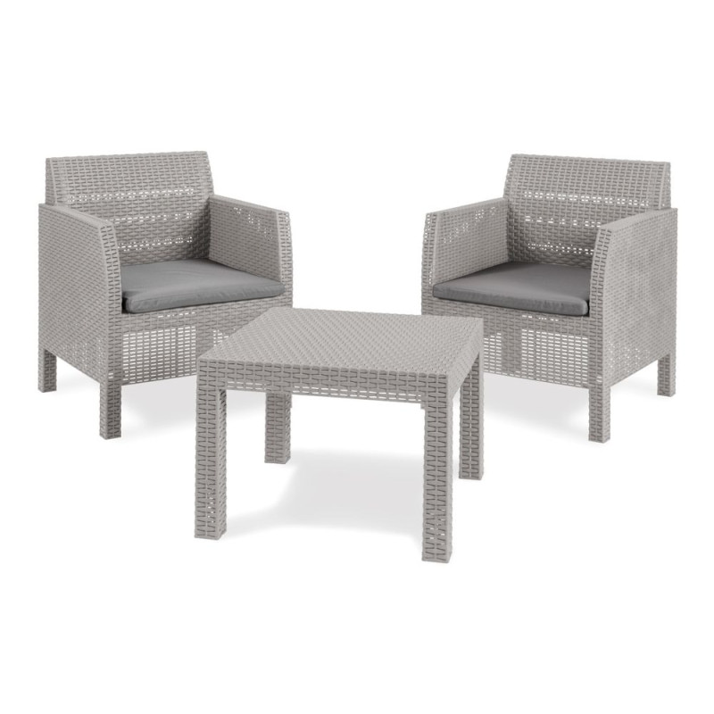 Vytvorte si oázu pokoja priamo na vašej terase alebo záhrade. Tento štýlový záhradný set v modernom sivom prevedení s imitáciou ratanu premení každý vonkajší priestor na miesto, kde si oddýchnete a načerpáte novú energiu. Pohodlné kreslá s poduškami sú ideálne na romantické večery alebo príjemné posedenie s priateľmi.