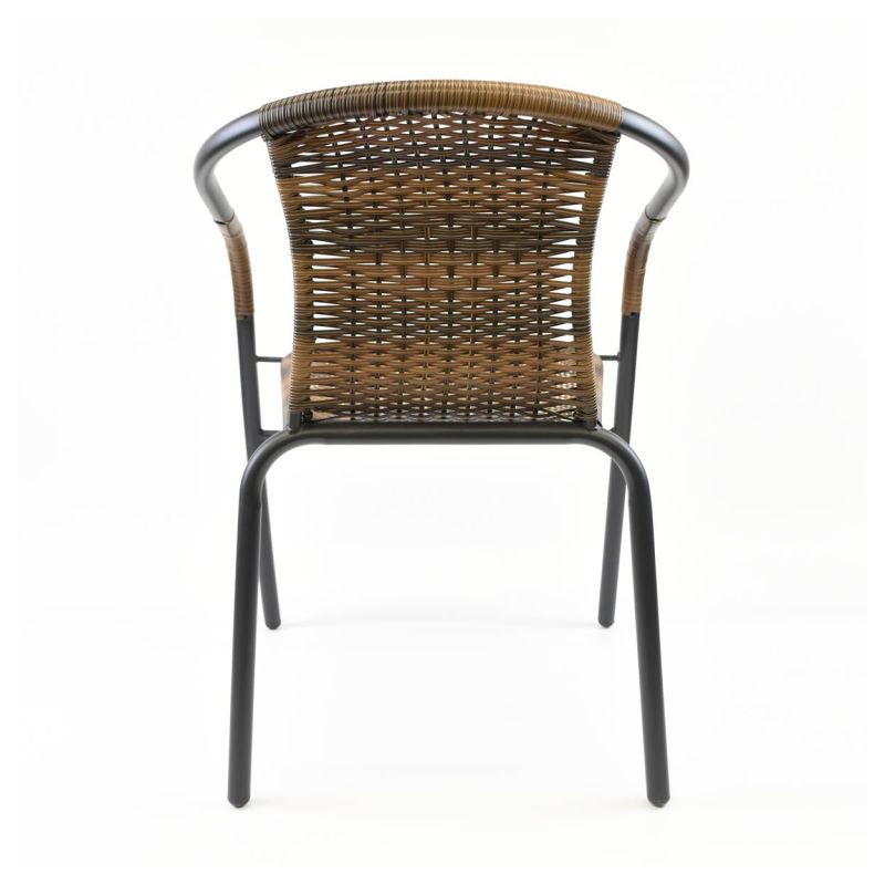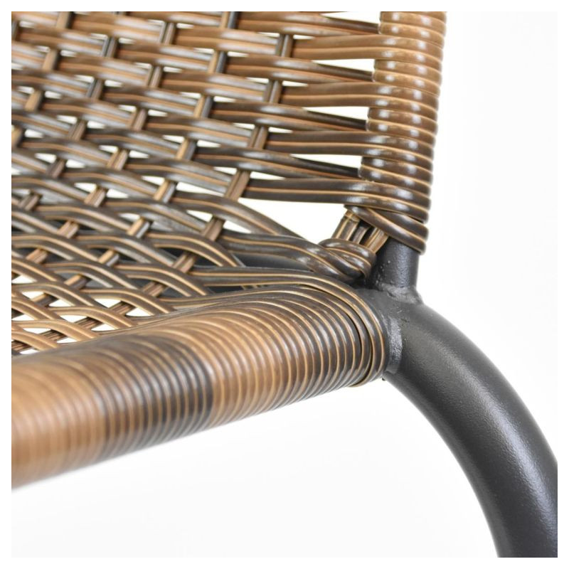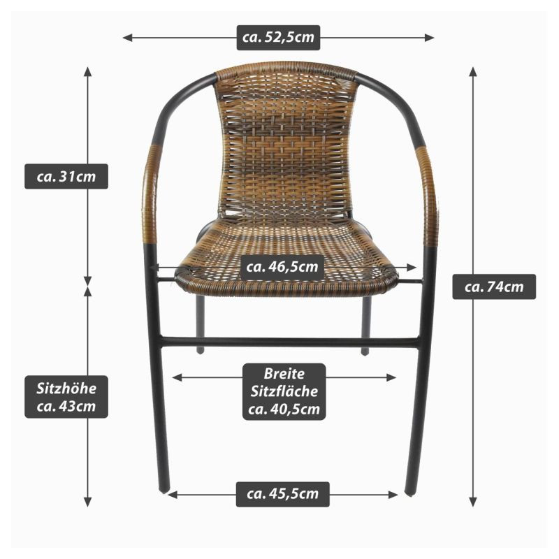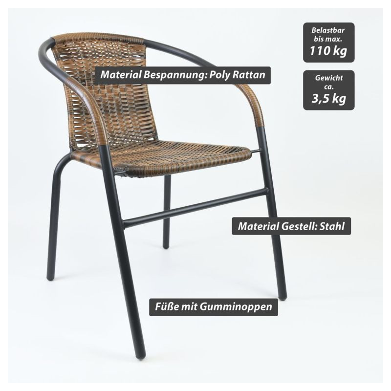 Bistro stolička pre pravú stredomorskú atmosféru v štýle francúzskych kaviarní a bistier je ľahkým a vkusným kúskom na posedenie. Niekoľko stoličiek tohto typu môžete naskladať na seba a ušetriť tak veľa miesta, pokiaľ chcete stoličku odložiť a uložiť ju na zimné mesiace. Použité materiály pri tejto stoličke sú nenáročné na údržbu, odolné vplyvu počasia a nevyžadujú špeciálne prostriedky na ošetrenie. Ľahká a napriek tomu robustná stohovateľná stolička s komfortnou ratanovou sedacou plochou je veľmi pohodlná. Oceľová konštrukcia je ošetrená práškovým povrchom a nohy majú gumové krytky, ktoré zabraňujú pošmyknutiu, tlmia hluk pri pohybe a chránia podlahu. Polyrattan je vyrobený z plastu, je odolný proti roztrhnutiu a zaujímavo tkaný. Skombinujte tieto stohovacie stoličky so zodpovedajúcimi malými okrúhlymi bistro stolíkmi dostupnými v našom obchode. Týmto spôsobom si môžete nakonfigurovať svoj vlastný bistro set.