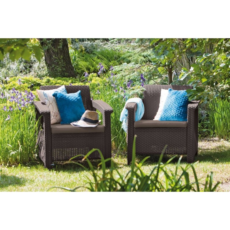 Set Corfu Duo sa skladá z dvoch kresielok. Kresielka sú z umelého plochého ratanu v hnedej farbe so sivohnedými poduškami. Záhradný nábytok z umelého ratanu je odolný voči nepriaznivému počasiu.