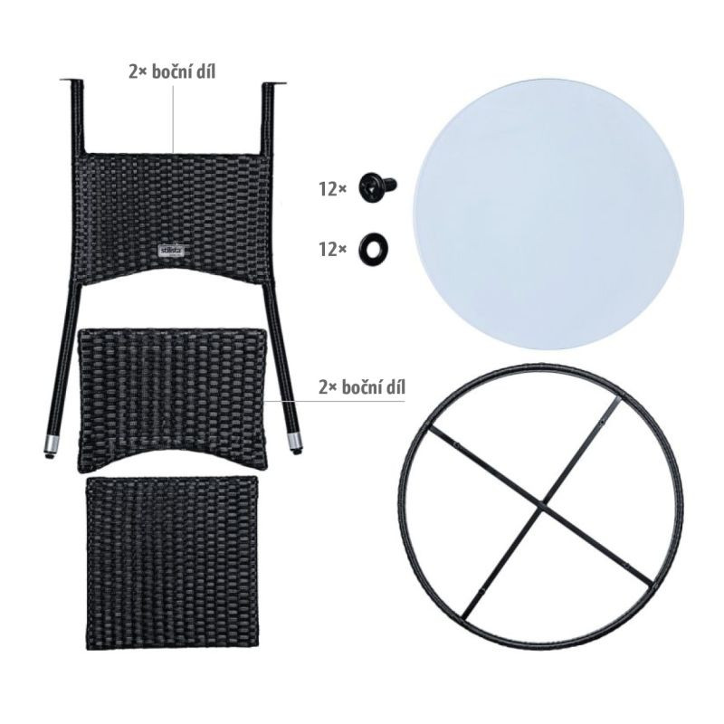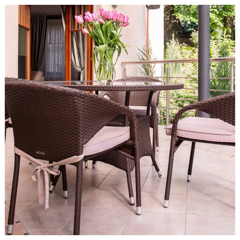 Robustná oceľová konštrukcia je zabalená do polyratanového prútia odolného proti poveternostným vplyvom a UV žiareniu, takže náš konferenčný stolík je ideálny na vonkajšie použitie. Vďaka predmontovaným vyrovnávacím skrutkám na bistro stole je možné veľmi ľahko vyrovnať stôl, ak by ste mali nerovný povrch podlahy. Obzvlášť stabilná stolová doska zo satinovaného bezpečnostného skla.