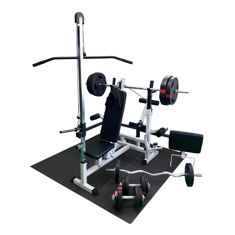 S týmto kompletným vybavením ste na tréning viac než pripravení a Váš dom sa rýchlo premení na vlastnú posilňovňu. Pre ochranu podlahy pred poškriabaním je súčasťou aj 18-dielna sada ochranných rohoží v čiernej farbe. Už by pre vás nemali existovať žiadne výhovorky, pretože s našou univerzálnou súpravou sa vašemu tréningu nekladú žiadne hranice. Posilňovacia lavica, lavica na ťahy s stojanom na činky, modul kladiek, nastaviteľný stojan na činky s integrovanými úchyty, veža na ťahy a nastaviteľná opierka chrbta zabezpečujú, že môžete vykonávať tréning celého tela. Nemusíte si robiť starosti ani s potrebným závažím.