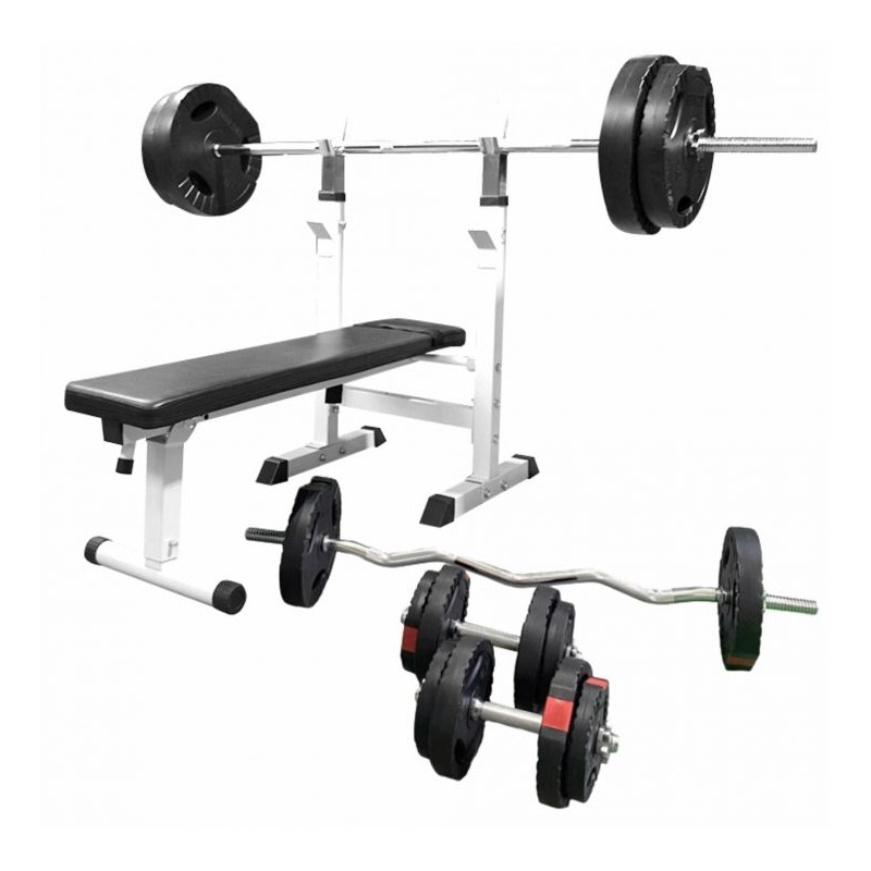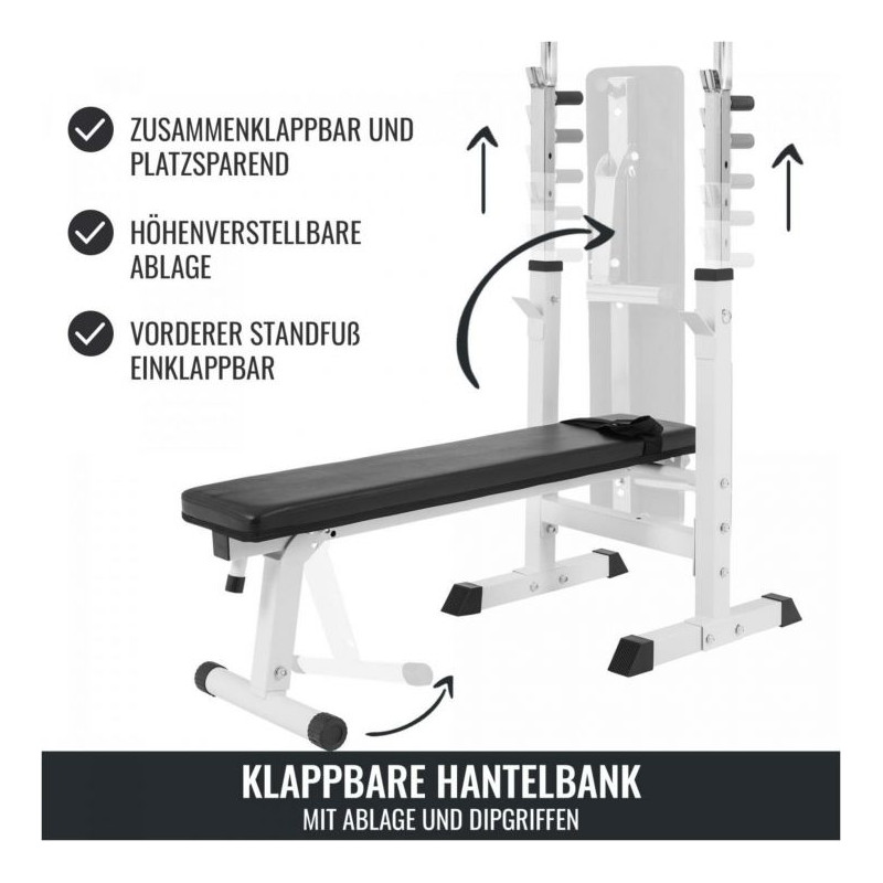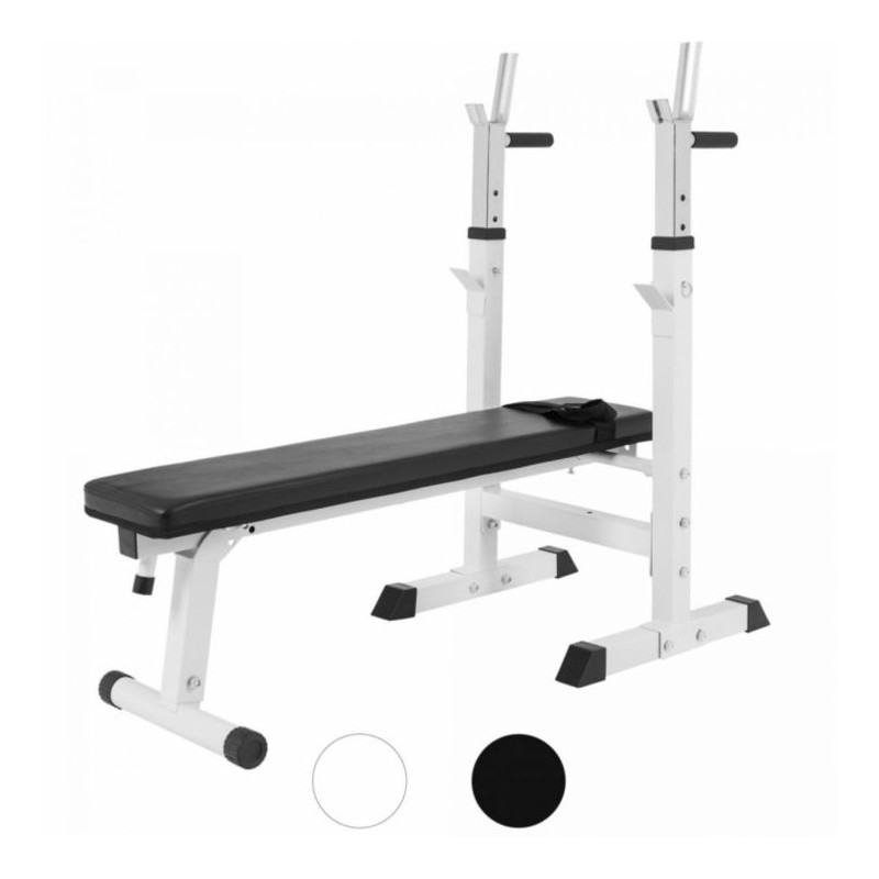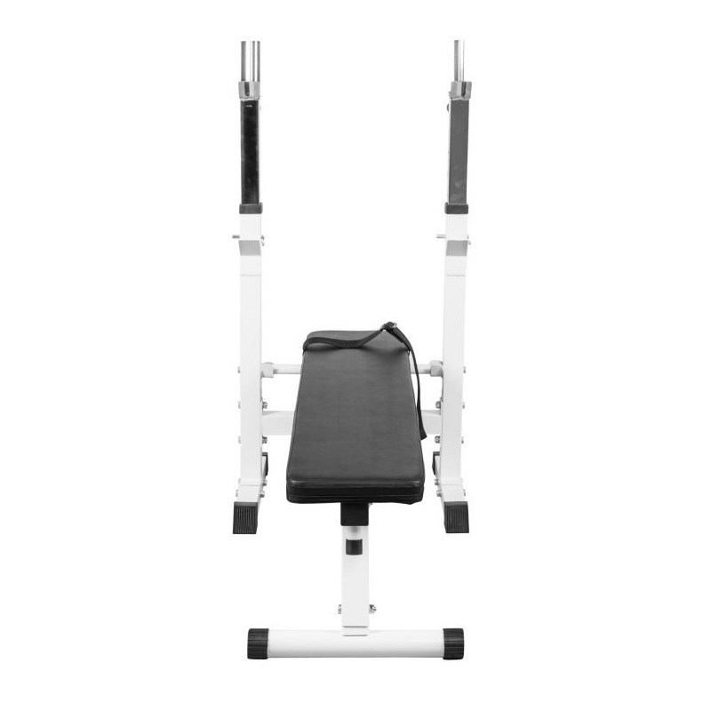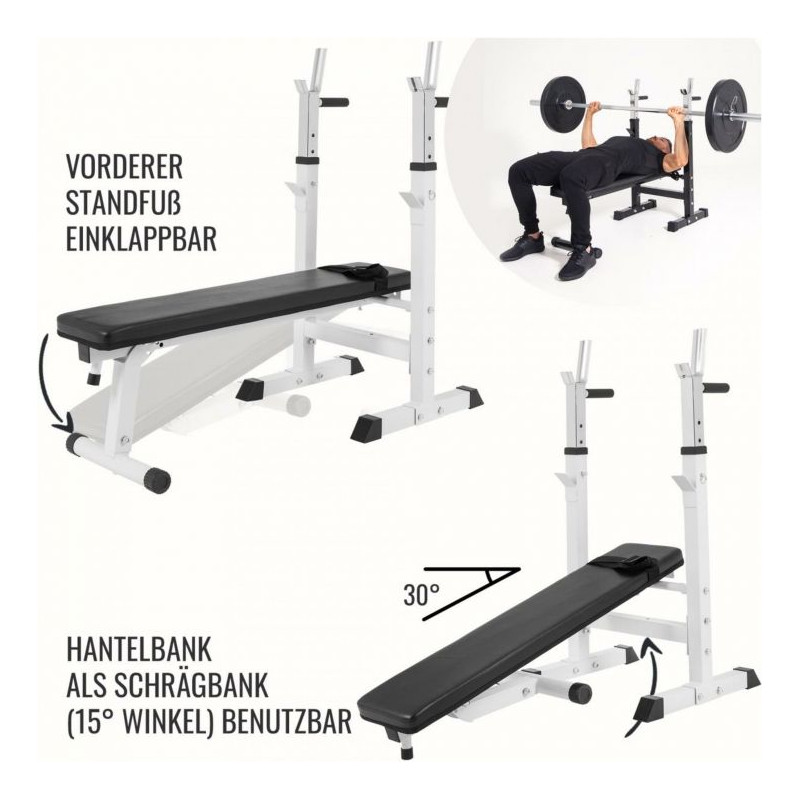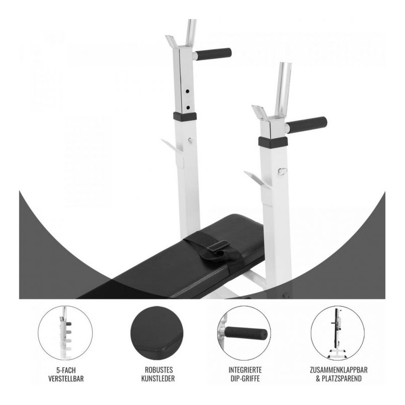 Posilňovací set je vhodný pre začiatočníkov aj pokročilých užívateľov. Pätipolohový stojan je ľahko nastaviteľný na správnu veľkosť pre vyvážené zaťaženie bez preťaženia kĺbov a väzov. Popruh na nohy pomáha posilňovať brušné svaly a integrované rukoväte pomáhajú posilňovať svaly prsného kôša a tricepsy. Štyri činkové tyče so závažiami rôznych váhových kategórií ponúkajú vhodné príslušenstvo pre efektívny tréning jednotlivých svalových skupín. Vďaka sklopným nohám je možné posilňovaciu lavicu používať aj ako sklonenú lavicu.
