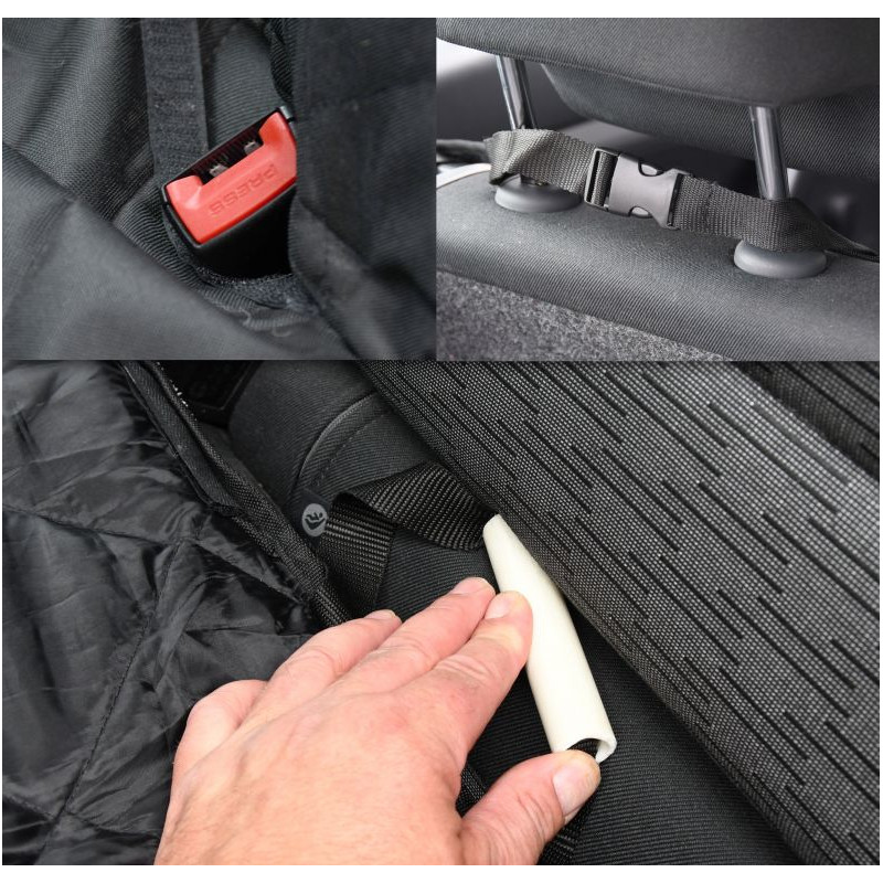 Prešívaný, viacvrstvový materiál zaisťuje pohodlné cestovanie psa. Deka ochráni aj zadnú stranu predných sedadiel, aj bočné strany sedadiel, a to vďaka ušiam na bokoch. Deka je vybavná otvormi pre bezpečnostné pásy, uzatvárateľné na suchý zips. Upevnenie je riešené za opierky hlavy s fixáciou medzi sedadlami.