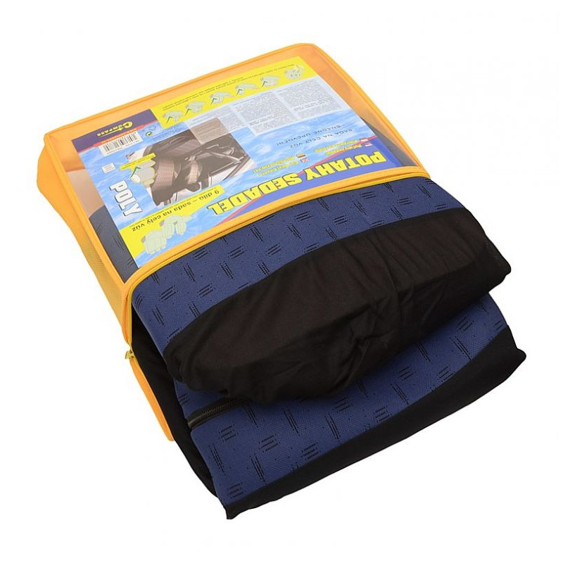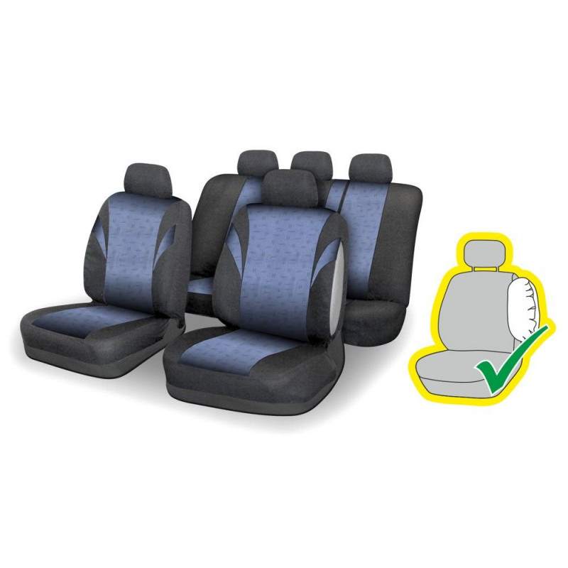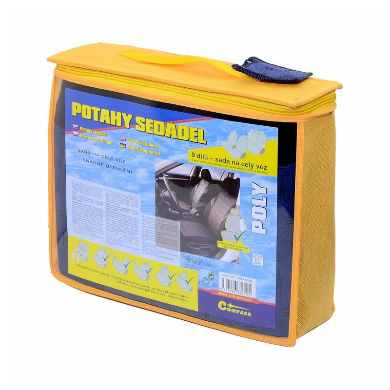 Poťah je možné použiť na sedadlách, ktoré majú zabudovaný bočný airbag priamo v operadle predných sedadiel. Balenie obsahuje poťah na predné sedadlo ( 2 x ), zadné sedák ( celý ), zadné operadlo ( pomocou zipsu deliteľné na 3 diely ), opierku hlavy ( 5 x ). Vďaka zipsom na zadnej operadlovej časti je možné poťahy použiť aj na vozidlá s delenými zadnými sedadlami a operadlá sklápať bez nutnosti sňatia poťahu.