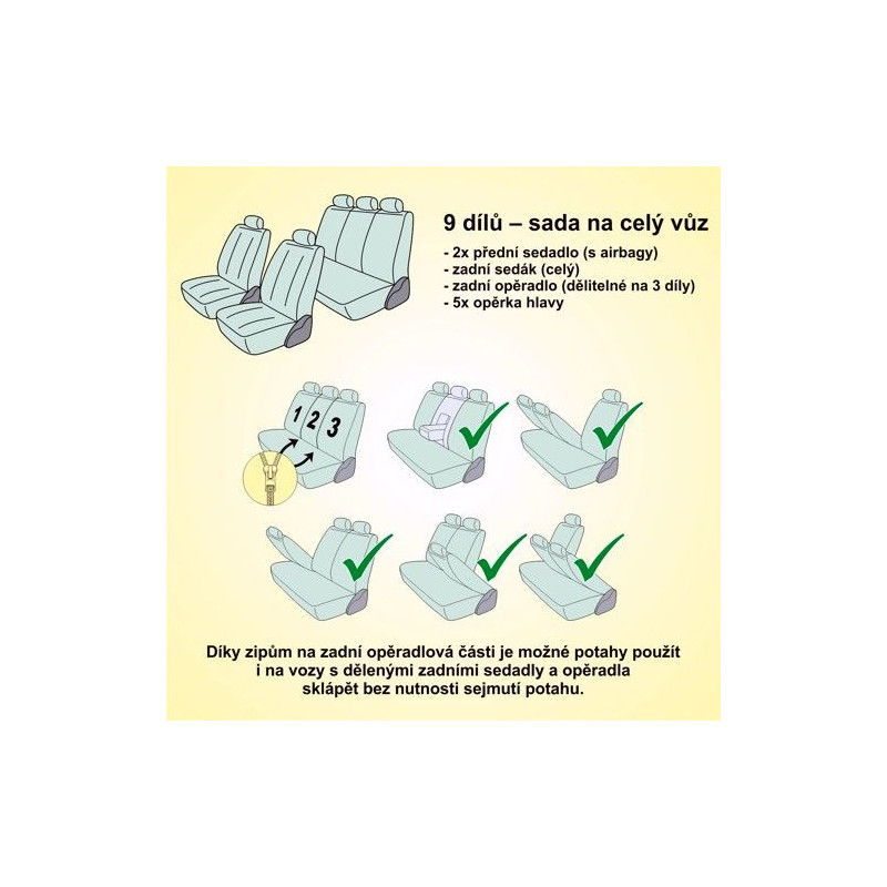 Poťah je možné použiť na sedadlách, ktoré majú zabudovaný bočný airbag priamo v operadle predných sedadiel. Balenie obsahuje poťah na predné sedadlo ( 2 x ), zadné sedák ( celý ), zadné operadlo ( pomocou zipsu deliteľné na 3 diely ), opierku hlavy ( 5 x ). Vďaka zipsom na zadnej operadlovej časti je možné poťahy použiť aj na vozidlá s delenými zadnými sedadlami a operadlá sklápať bez nutnosti sňatia poťahu.