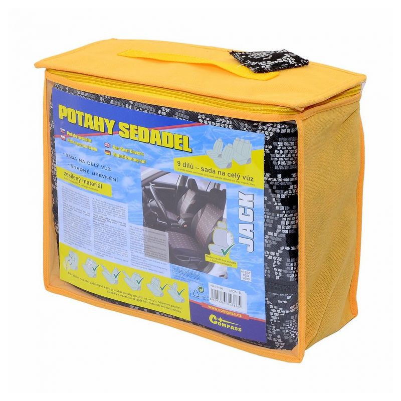 Poťah je možné použiť na sedadlách, ktoré majú zabudovaný bočný airbag priamo v operadle predných sedadiel. Balenie obsahuje poťah na predné sedadlo ( 2 x ), zadné sedák ( celý ), zadné operadlo ( pomocou zipsu deliteľné na 3 diely ), opierku hlavy ( 5 x ). Vďaka zipsom na zadnej operadlovej časti je možné poťahy použiť aj na vozidlá s delenými zadnými sedadlami a operadlá sklápať bez nutnosti sňatia poťahu.
