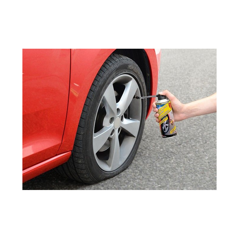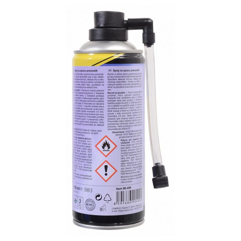 Návod na použitie: 1. Pokiaľ je to možné odstrániť predmet, ktorý spôsobil prepichnutie. 2. Nastavte koleso ventilom hore. 3. Dôkladne pretrepte sprej pred použitím. 4. Naskrutkujte hadičku spreja na ventilček. 5. Držte sprej vzpriamene a zatlačte na spúšťač spreja. 6. Pneumatika sa nafúkne a utesní za 1-3 minúty. 7. Uzavrite ventil bicykla a ihneď sa rozbehnite, aby sa prípravok v kolese rovnomerne rozprestrel (ujeďte minimálne 3-5 km). Takáto oprava len dočasná (pre núdzové dojatie k pneuservisu). Pneumatiku je potrebné následne odborne opraviť. V pneuservise informujte obsluhu o použití tohto prípravku.
