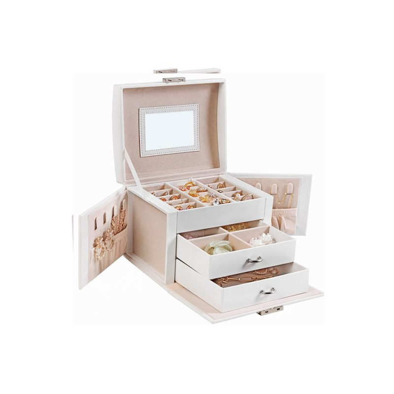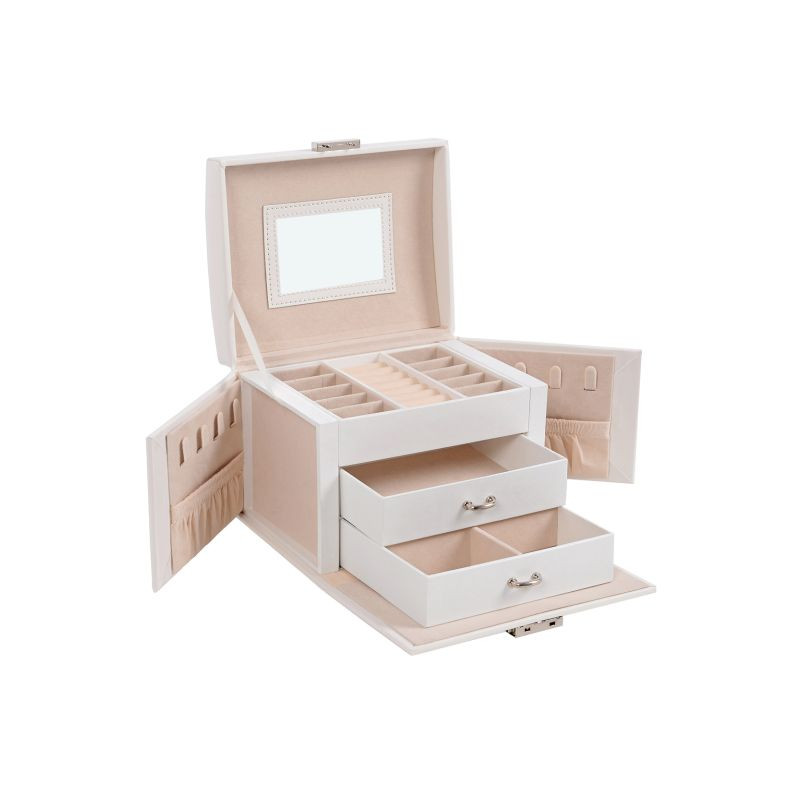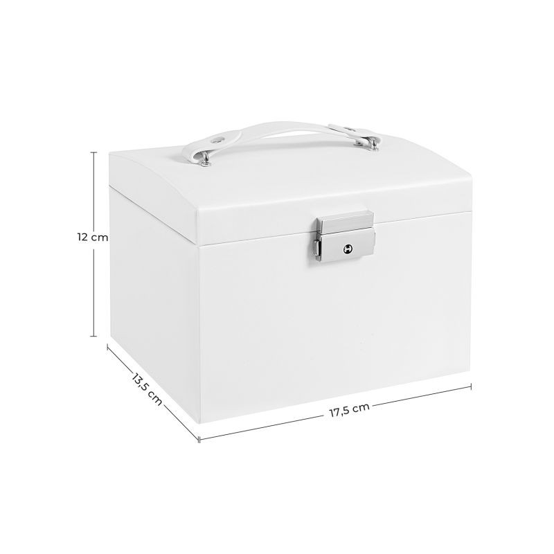 Poteší zamykanie s 2 kľúčmi, pevné PU kožené prevedenie na MDF a uzavreté zásuvky proti prachu. Údržba je jednoduchá - stačí utrieť. Vďaka hornému madlu šperkovnicu ľahko prenesiete aj na cesty.
