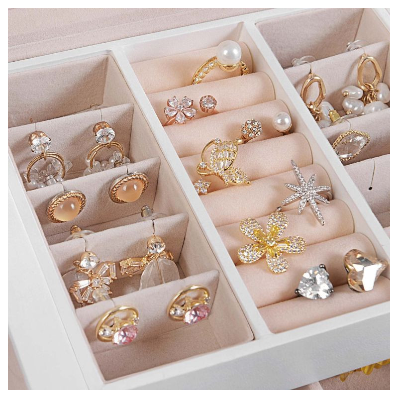 Vneste do svojej zbierky poriadok aj štipku luxusu. Tri poschodia, bočné háčiky na náhrdelníky a vnútorné zrkadlo udržia prstene, náušnice aj prívesky krásne roztriedené. Mäkký zamatový interiér šperky rozmaznáva a každý kúsok rýchlo nájdete.