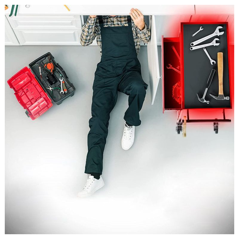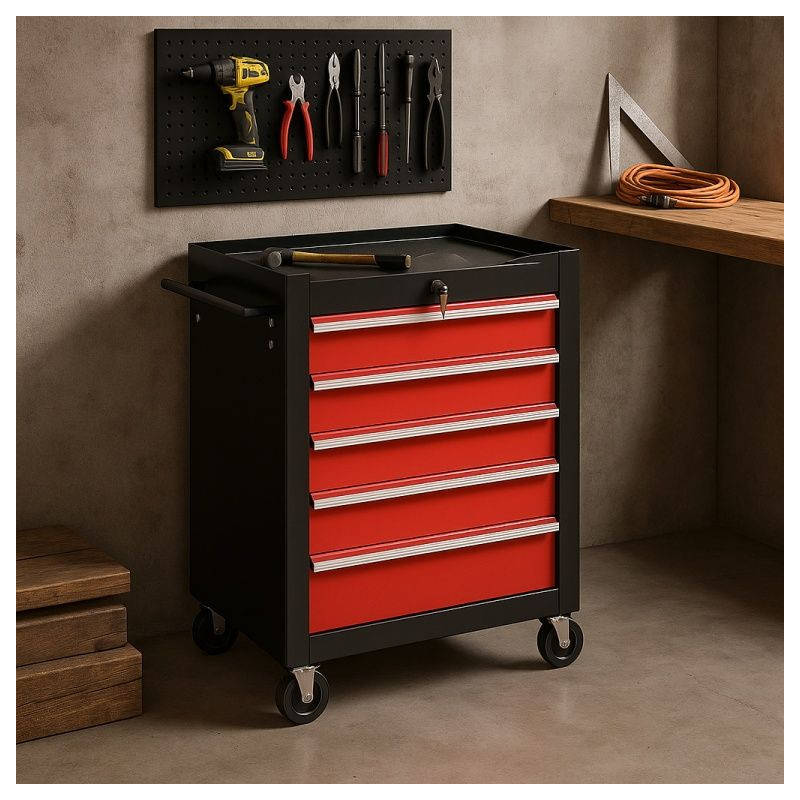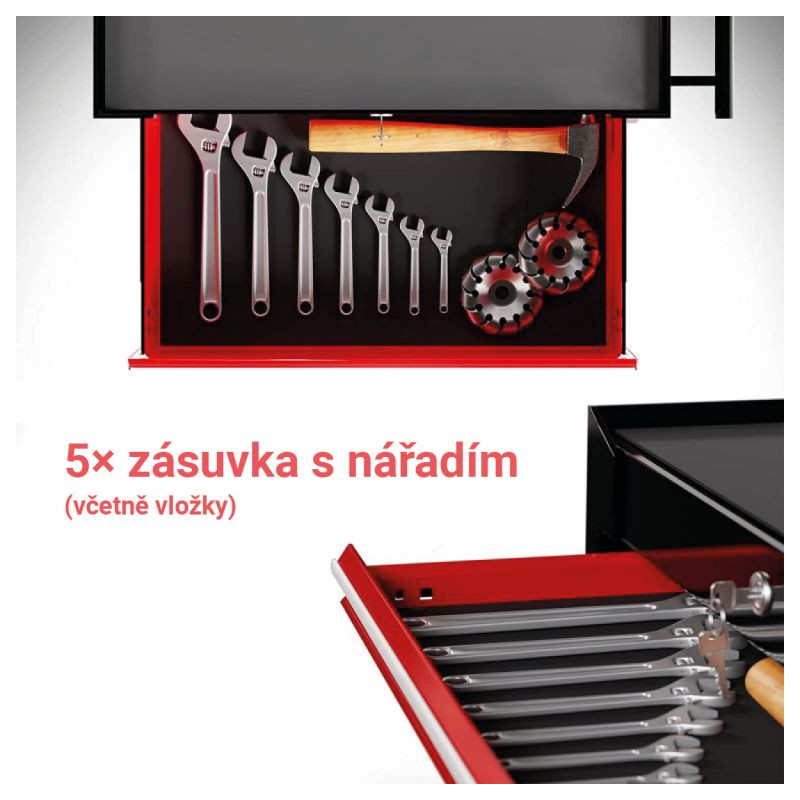 Vozík na náradie bol navrhnutý pre Vaše náradie, ktoré potrebujete mať vždy po ruke, a pomôže Vám udržať poriadok v garáži. Mobilný dielenský vozík je vybavený úložným priestorom a piatimi zásuvkami (s vložkami), ktoré ponúkajú dostatok úložného priestoru pre dôležité dielenské príslušenstvo. Tento montážny vozík má 4 riadiace kolesá, z ktorých 2 majú parkovacie brzdy, takže vozík môžete v garáži voľne premiestňovať, ale aj ho zafixovať na jednom mieste. Integrovaný centrálny zámok uzamkne všetky zásuvky naraz, takže ich počas prepravy nie je možné otvoriť a všetky Vaše veci sú bezpečne uložené v skrini na náradie.