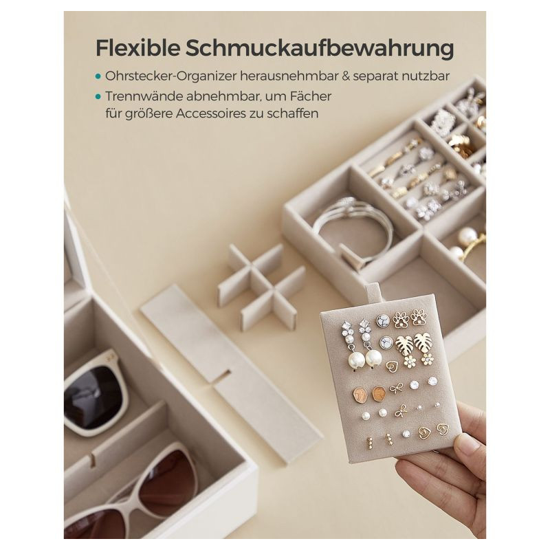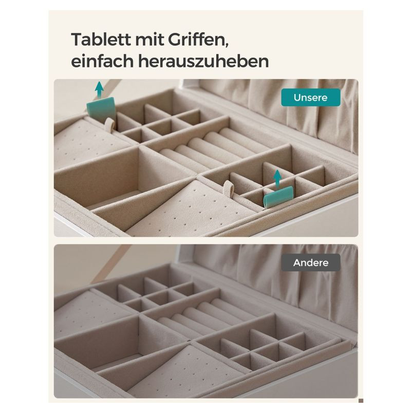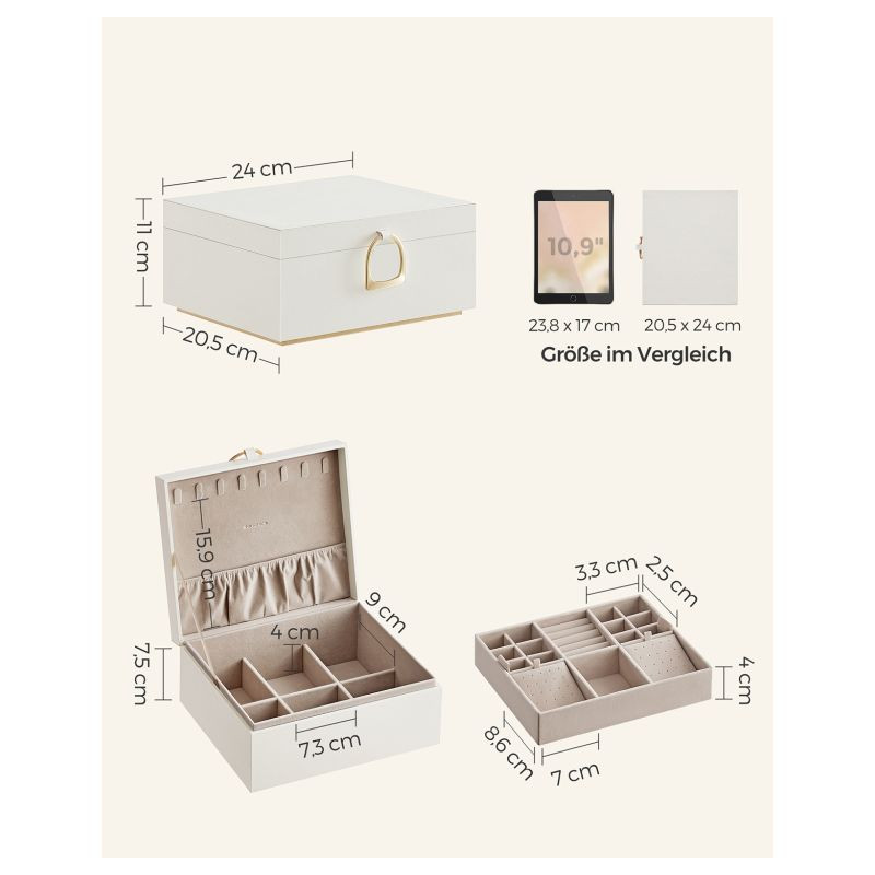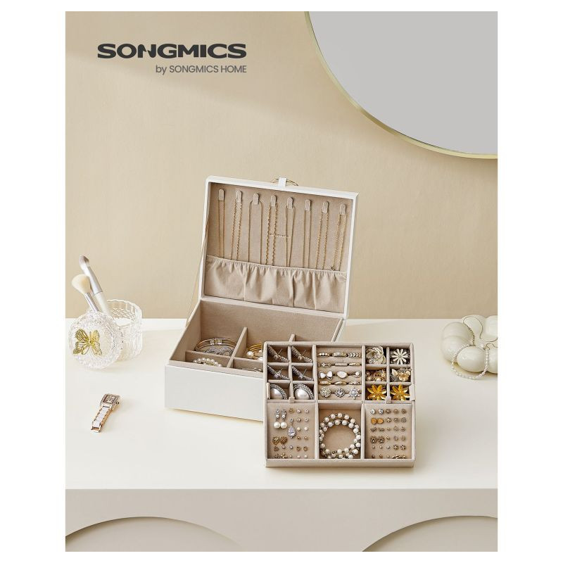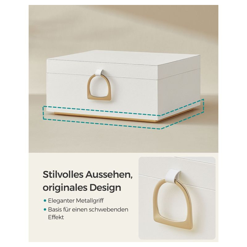 Túžite po tom, aby mali vaše šperky, hodinky aj drobné doplnky svoje vlastné miesto? Táto štýlová šperkovnica SONGMICS vás očarí originálnym dizajnom v bielo-zlatom prevedení, ktorý pôsobí luxusne a nadčasovo. Praktická vyberateľná priehradka, elegantný kovový úchyt a efekt plávajúcej základne dodávajú celej krabičke jedinečný vzhľad, ktorý sa hodí do každého interiéru.