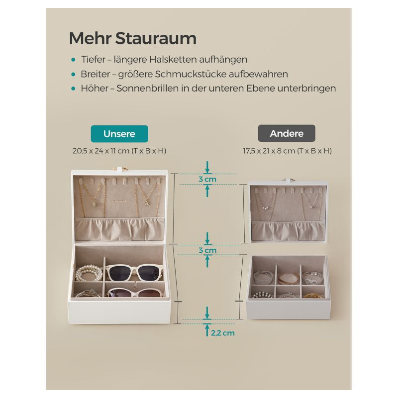 Pod pevnou MDF konštrukciou a jemným zamatovým vnútrom nájdete chytré členenie úložného priestoru. Horná časť je ideálna na náušnice a prstienky, spodné poschodie poskytne dosť miesta na hodinky, náramky či dokonca slnečné okuliare. Háčiky na veku udržia retiazky bez zamotania a odnímateľné prepážky prispôsobíte podľa potreby. Robustné prevedenie a zamatová ochrana zaistí, že vaše cennosti zostanú v bezpečí aj bez jedinej škrabnutia.