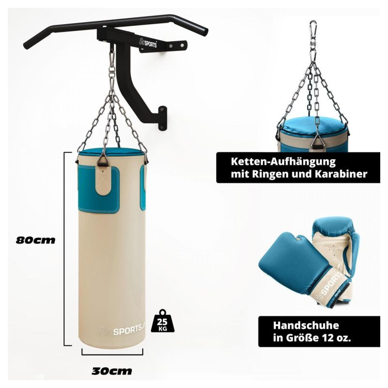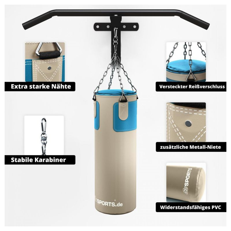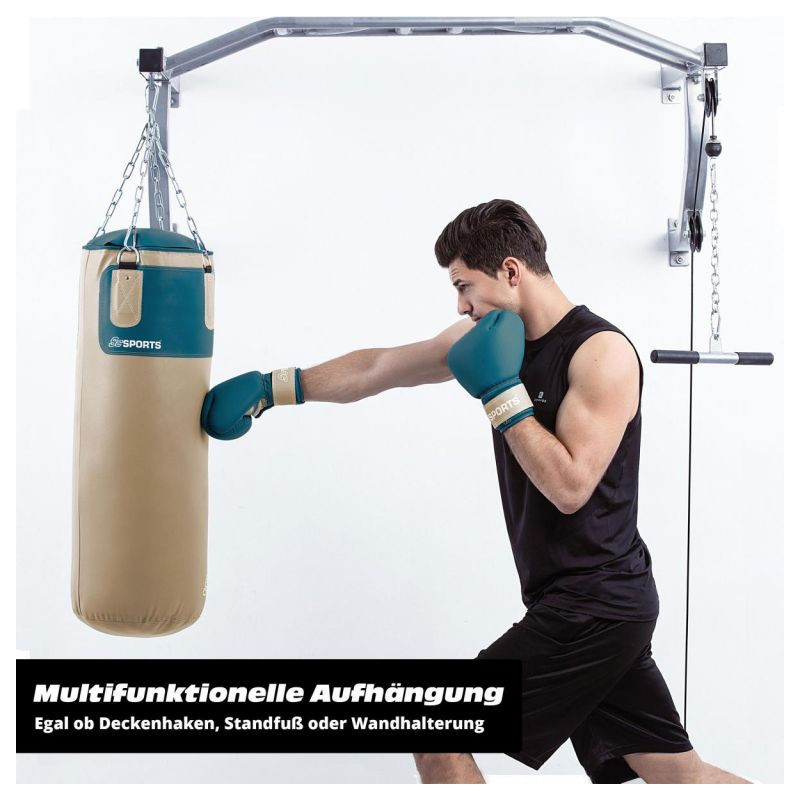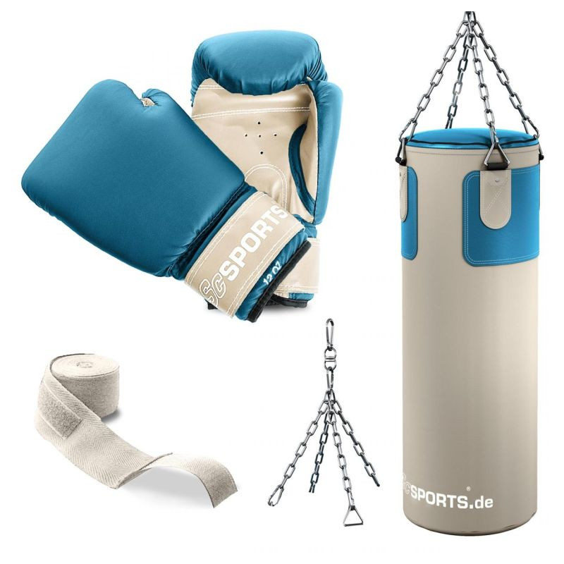 Boxovacie vrece je vyrobené z pevného PVC s bavlnenou výplňou pre dlhú životnosť. Montáž je jednoduchá vďaka robustnej reťazi a karabíne. Rukavice sú polstrované a bandáže chránia zápästie. Materiály sú odolné a ľahko sa čistia.
