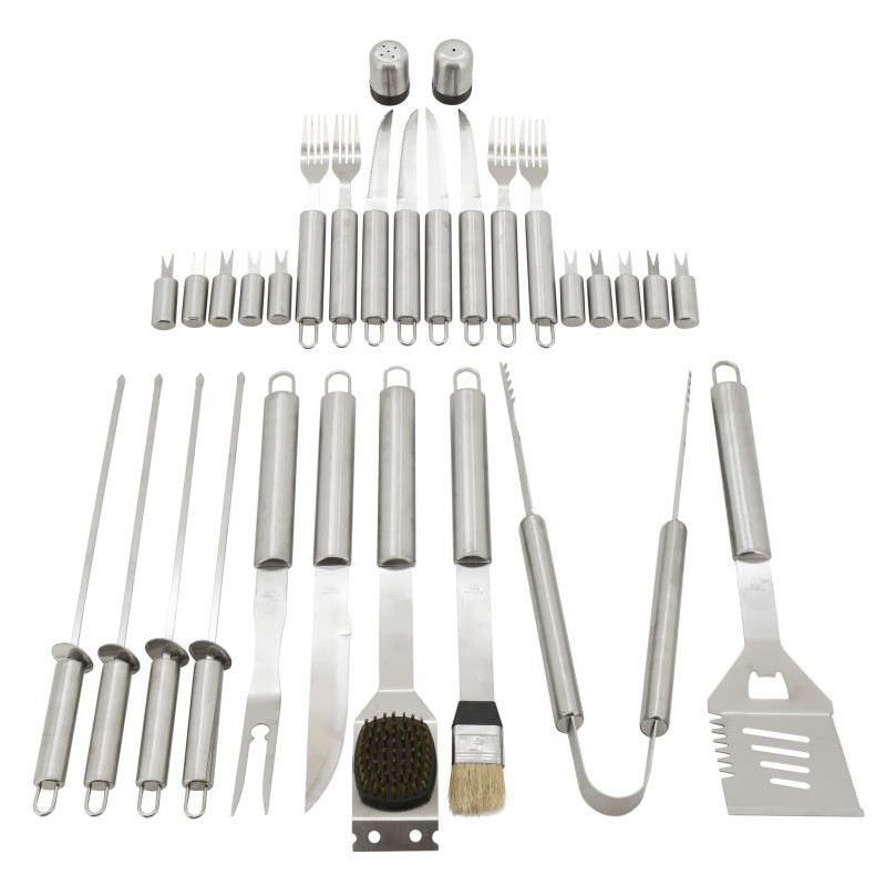Sada obsahuje všetky nástroje na prípravu a konzumáciu najrôznejších pokrmov, ale aj následnú údržbu grilu. Všetky nástroje sú navyše kvalitné a vyrobené z nerezovej ocele.