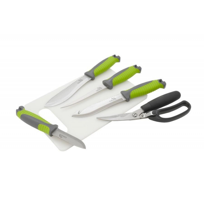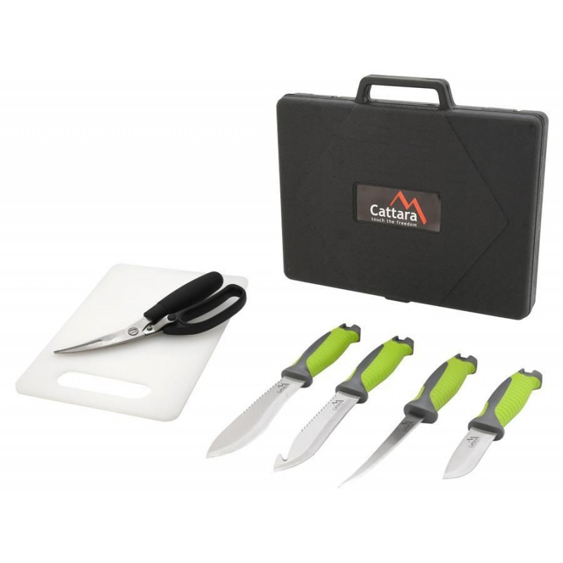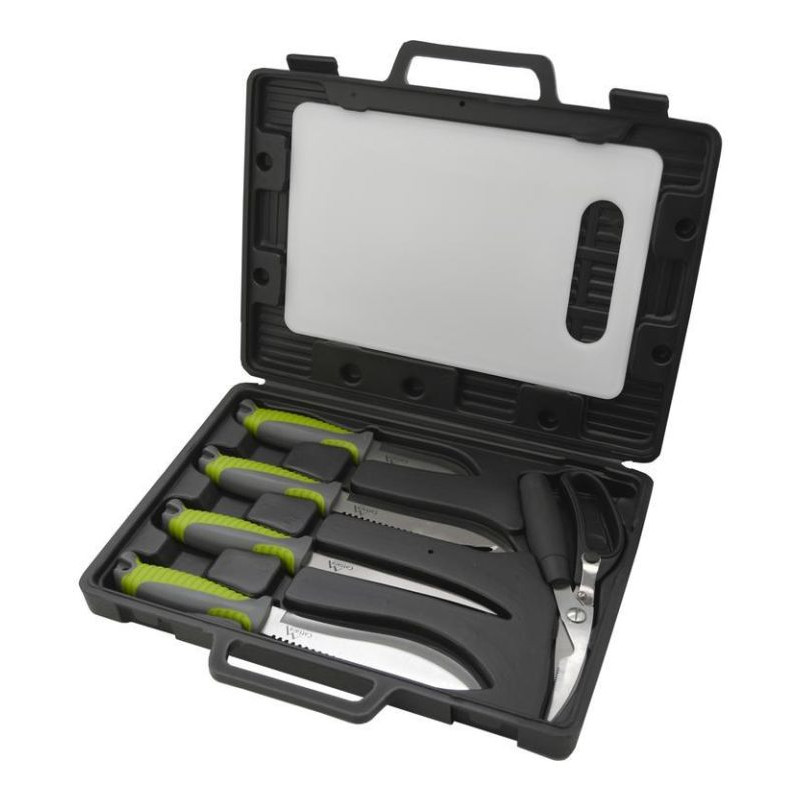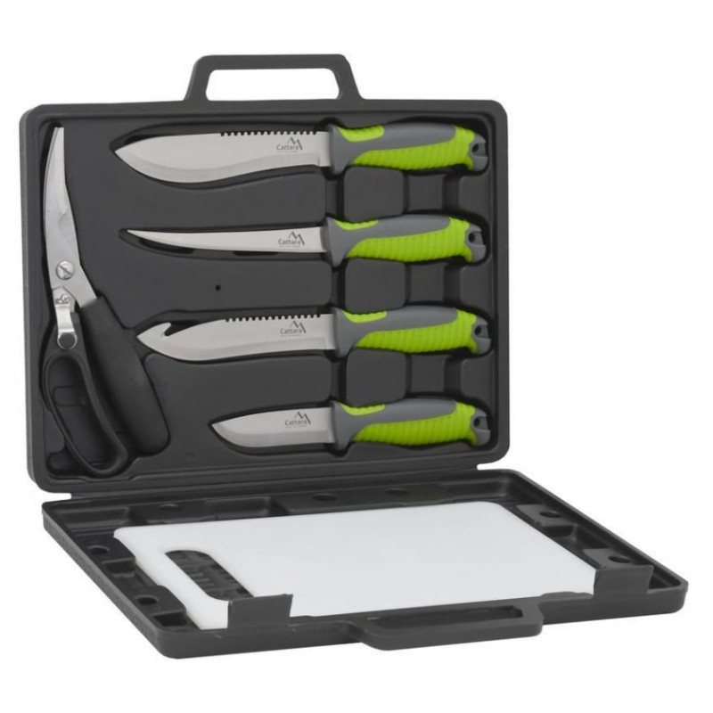 Grilovacia sada skladajúca sa zo 4 ks nožov, nožníc na hydinu a ryby a dosky pre pohodlné porciovanie. Malý, stredný, veľký a filetovací nôž je vyrobený z kvalitnej nehrdzavejúcej ocele s plastovou, ergonomicky tvarovanou rukoväťou s pogumovaným povrchom. V sade sú aj praktické nožnice na hydinu či ryby s posunovacou poistkou. Sú vybavené širokou rukoväťou pre pohodlné držanie a následné porciovanie. Nožnice sú vyrobené z kvalitnej nehrdzavejúcej ocele, rovnako ako nože. Ďalším prvkom sady je plastová doštička pre pohodlné porciovanie. Celá sada je úhľadne umiestnená v transportnom kufríku. Sadu tak využijete ako doma na záhrade, tak aj na cestách.