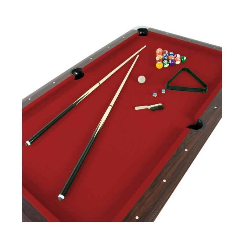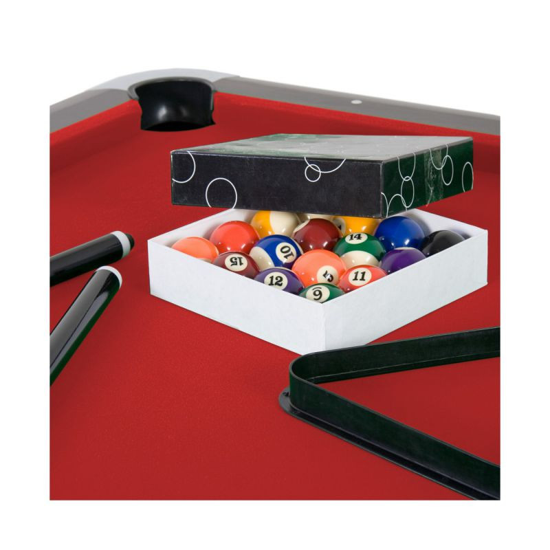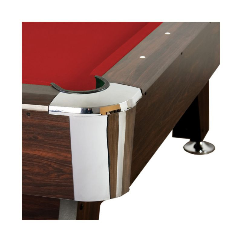 Biliardový stôl s vysokou stabilitou, štýlovo hnedý s červeným plátnom. Biliardový stôl má nastaviteľné nohy, vďaka ktorým je možné hrať aj na nerovnej podlahe. Otvor pre centrálne vrátenie gulí je umiestnený v prednej strane stola, takže je vždy prístupný a môžete vždy začať hrať znova. Biliardový stôl je možné ľahko udržiavať, korpus stačí utrieť vlhkou handrou s vodou zriedenou jemným saponátom a plátno stačí zamiesť kefou. Telo je kompletne predmontované, Vy budete musieť iba pripevniť nohy a môžete začať hrať!