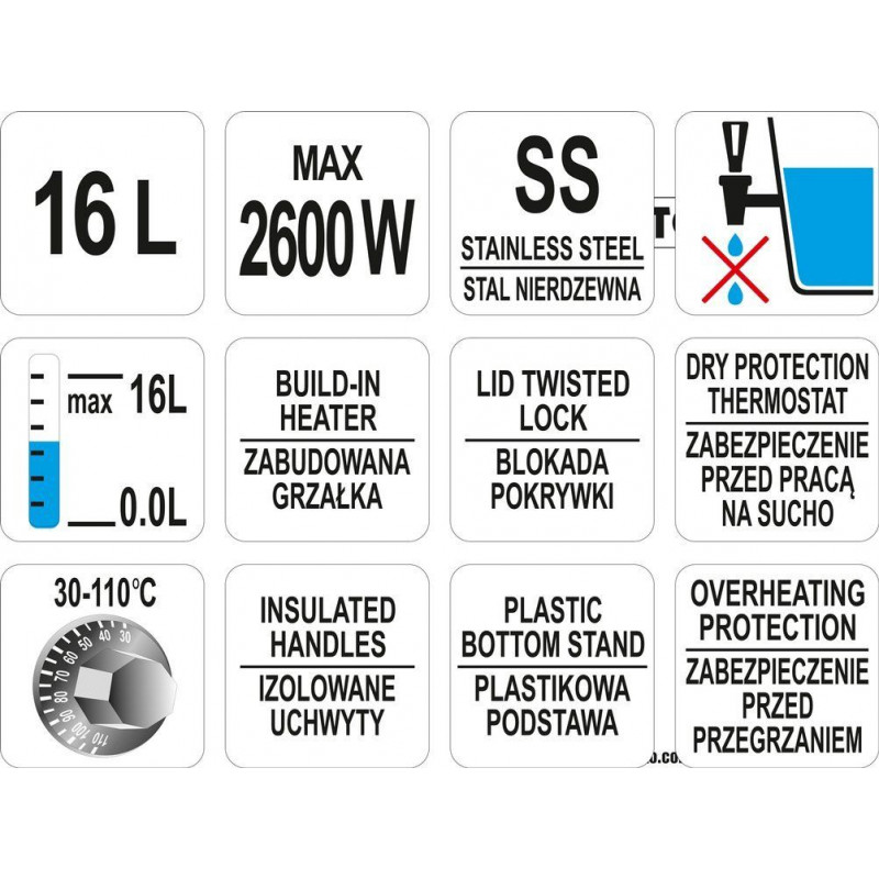 Sporák je nastaviteľný v rozsahu 30 ~ 110 °C. Na druhú stranu vstavaná kontrolka signalizuje ohrev vody. Prepínač umožňuje vypnúť zariadenie bez odpojenia zástrčky zo zásuvky. Na vonkajšej strane nádoby je ukazovateľ hladiny vody so stupnicou vyjadrenou v litroch. Po oboch stranách sú pohodlné, na dotyk príjemné držadlá. Ich konštrukciou je aj systém TWIST-LOCK, vďaka ktorému je možné veko pevne zavrieť.