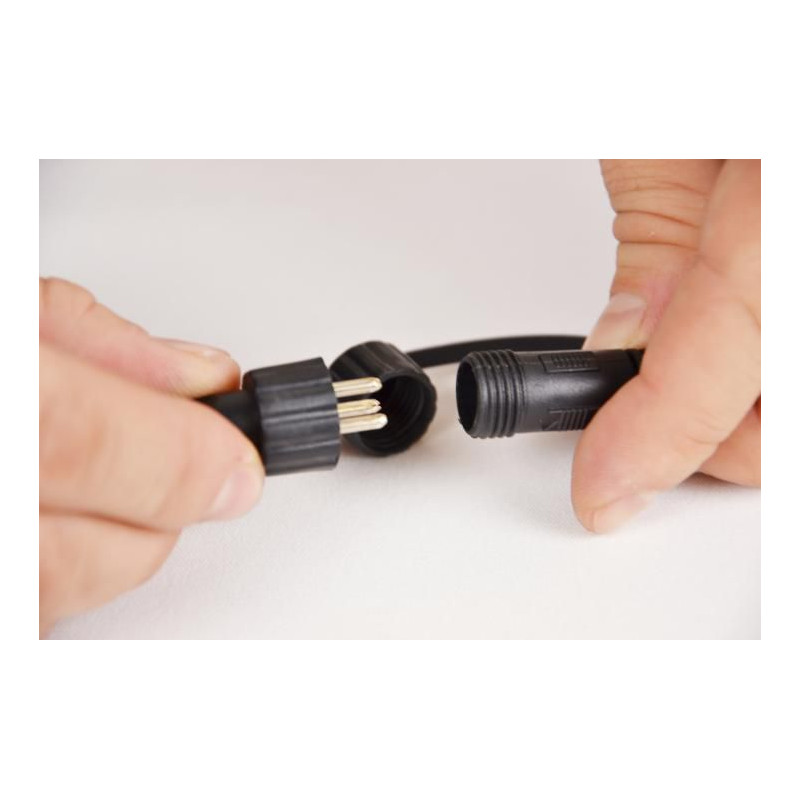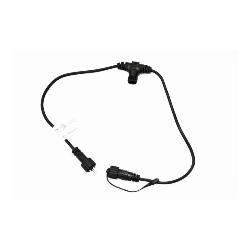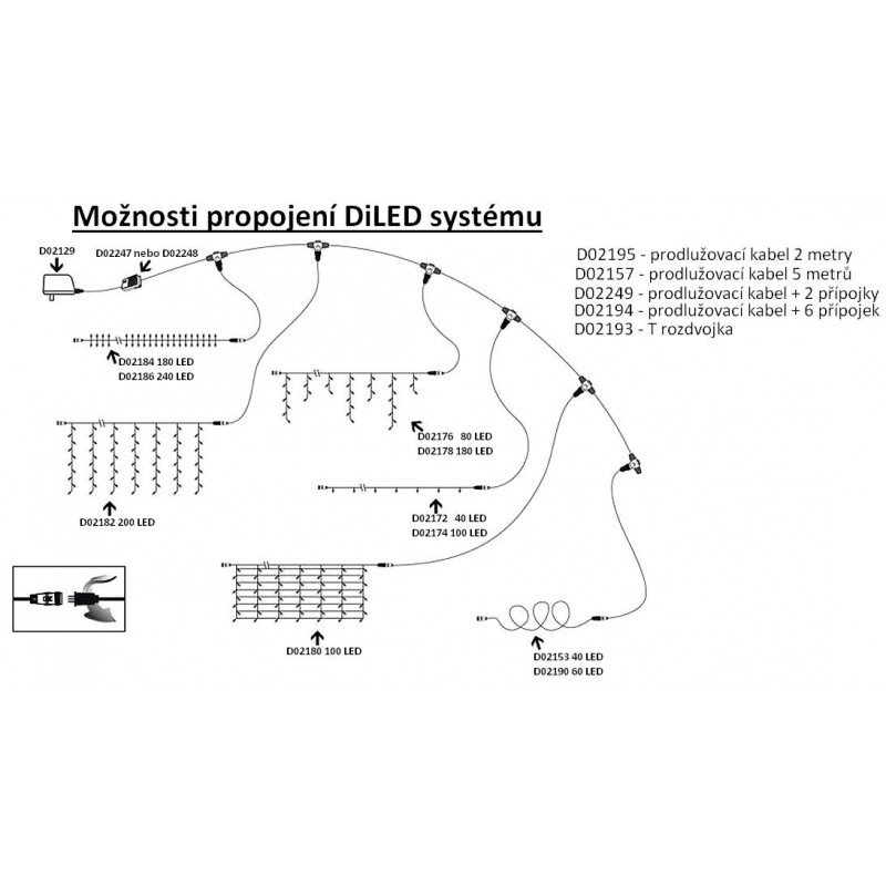 "Prečo svetelný systém diLED? Jedná sa o profesionálny svetelný systém vhodný pre vnútorné aj vonkajšie použitie s veľkým dôrazom kladeným na bezpečnost. LED diódy sú odolné proti otrasom, nevydávajú teplo a majú životnosť až 50 000 hodín. Diódy použité v osvetlení diLED sú ešte úspornejšie ako klasické LED diódy, príkon na 100 diód je len 3 W. Najväčšou výhodou diLED systému je, že si ho môžete prispôsobiť podľa svojich možností a predstáv. Tieto osvetlenia možno na seba napájať až do rozšírenia 2 000 diód v spojení s daným typom trafa. Technické údaje: predlžovací kábel s 2 prípojkami čierny kábel 1 vstup 2 výstupy vzdialenosť medzi výstupmi 25 cm dĺžka: 60 cm pre vonkajšie použitie možnosť rozšírenia až na 2000 LED diód so všetkými diLED produkty Obsah balenia: diLED predlžovací kábel s 2 prípojkami"