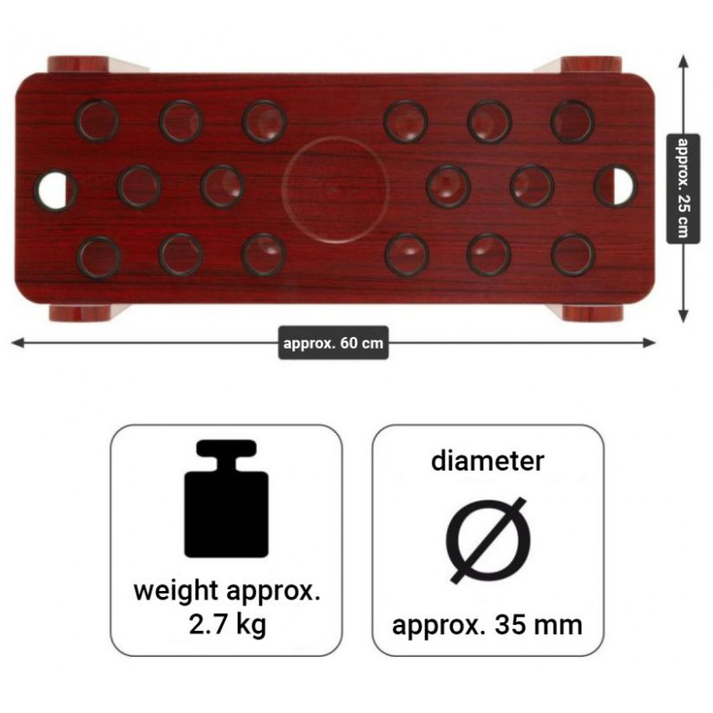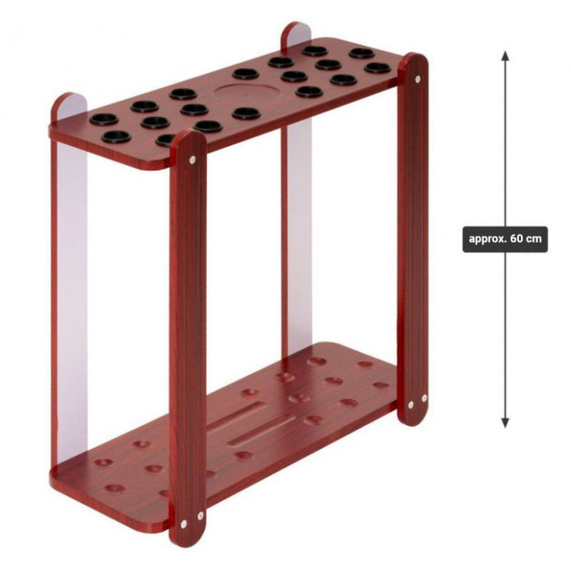 Stojan na tága ponúka priestor až pre 18 tág a má odkladací priestor na pohár, fľaše alebo popolník. Na rozdiel od nástenných držiakov je možné voľne stojaci stojan na tága nastaviť a umiestniť samostatne a nevyžaduje žiadnu ďalšiu montáž. Elegantný povrch stojana je vodeodolný a odolný proti poškriabaniu, takže príslušenstvo ako biliardový trojuholník, biliardová krieda a štetec na stojan je možné bez váhania umiestniť. Držiak tág je dokonalým doplnkom bez ohľadu na to, či ste profesionálny športovec, amatér alebo príležitostný hráč v krčme.