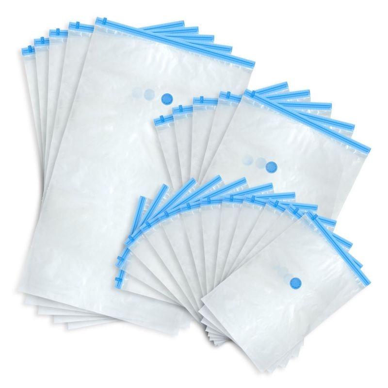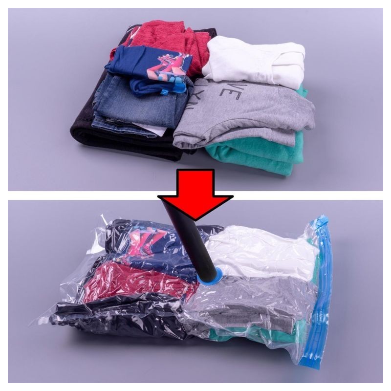 Vďaka modernej tesniacej technike sáčky spoľahlivo udržujú vzduch trvale a opakovane. Skladovacie vaky možno ľahko vysať pomocou vysávača a vďaka dvojitému tesneniu a špeciálnemu ventilu trvale udržiavajú podtlak. Textílie sú vo vákuovom vaku chránené pred škodlivým vplyvom prostredia ako je vlhkosť, pachy, škodcovia alebo plesne. Vákuové sáčky vytvárajú miesto vo vašom šatníku alebo cestovnom kufri. Vrecia možno ľahko pomocou ručnej pumpy odsať, čo prináša úsporu priestoru cca 80 %. Či už doma v skrini, pre uloženie sezónneho oblečenia alebo pri cestovaní. Naše vákuové sáčky sú praktickými pomocníkmi v domácnosti. Vrecká sú vyrobené z robustného transparentného plastu PA + PE.