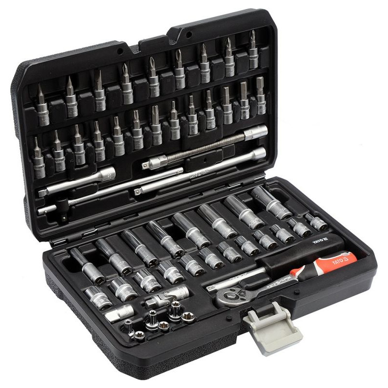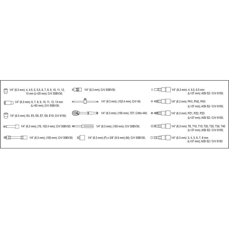 Gola sada 1/4" obsahuje 56 ks: nástavcov, predlžovacích nástavcov, račňu s plastovou rukoväťou a ďalšie príslušenstvo. Vyrobené z kvalitnej ocele CrV50BV30, CrV40, CrV6150, CrMo440 a S2 s funkciou AS-DRIVE. Račňa má ý. vyvinúť väčšiu kontaktnú silu, pretože ku kontaktu so skrutkou nedochádza na hranách šesťhranu, ale v prvej tretine styčných plôch. Tým nedochádza k poničeniu hlavice skrutky.