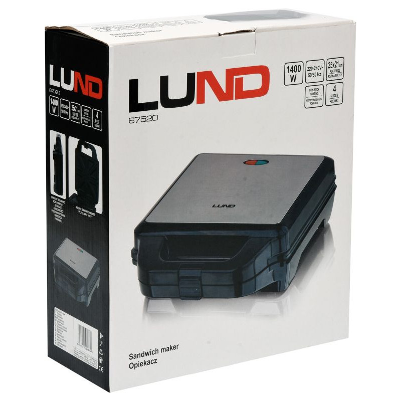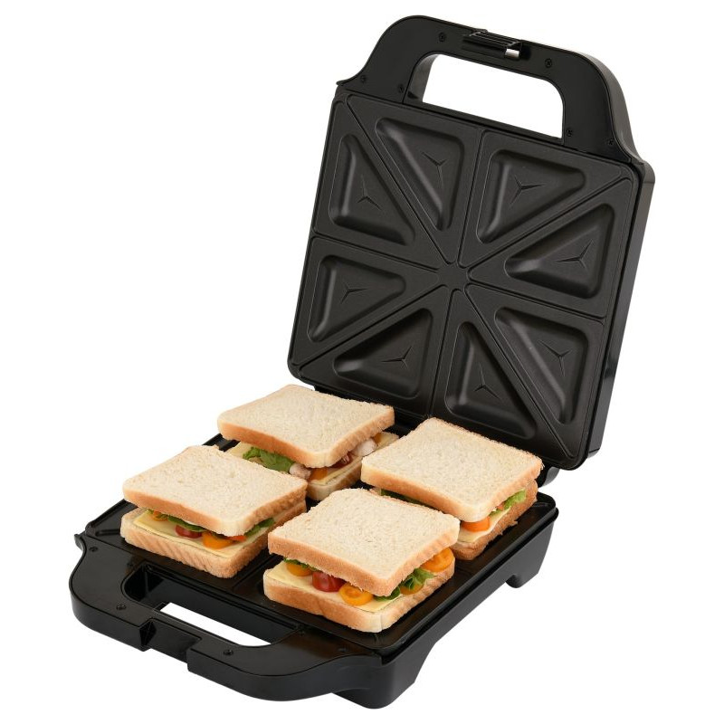 Sendvičovač na opekanie 4 toastov.Prístroj je vybavený nepriľnavým povrchom na jednoduché čistenie a zároveň zaisťuje rovnomerné opekanie.Napájanie cez 230 V zabezpečuje 0,7 m dlhý kábel.