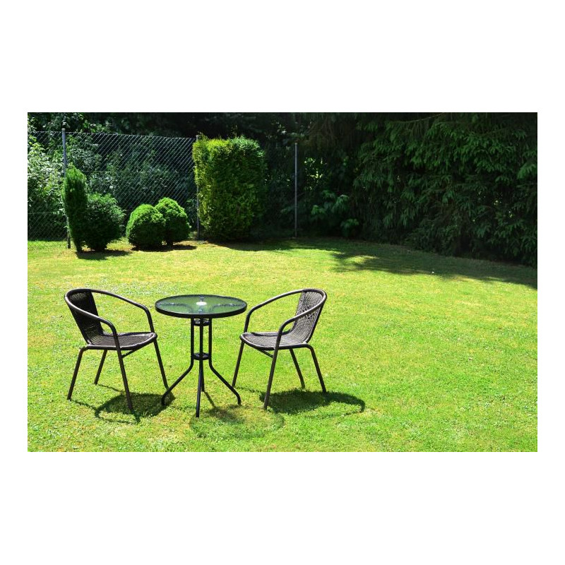 Užite si pohodové chvíle na terase alebo balkóne pri obľúbenej šálke čaju či kávy. Tento ľahký, ale napriek tomu vysoko stabilný bistro stolík má sklenenú dosku s otvorom na slnečník. Oceľový rám stolíka je lakovaný, nohy sú vybavené protišmykovým materiálom. Stoličky doplňujúce set majú výplet z polyratanu a ponúkajú vysoký komfort pri sedení. Použité materiály sú veľmi odolné voči nepriaznivému počasiu, nevyžadujú údržbu ani špeciálne čistiace prostriedky.