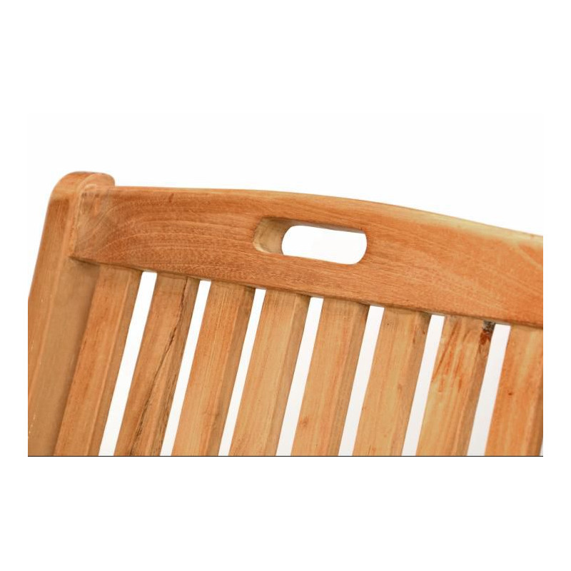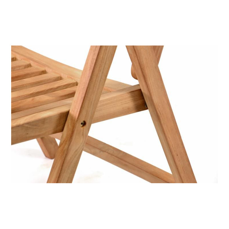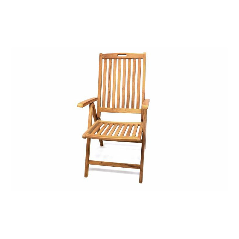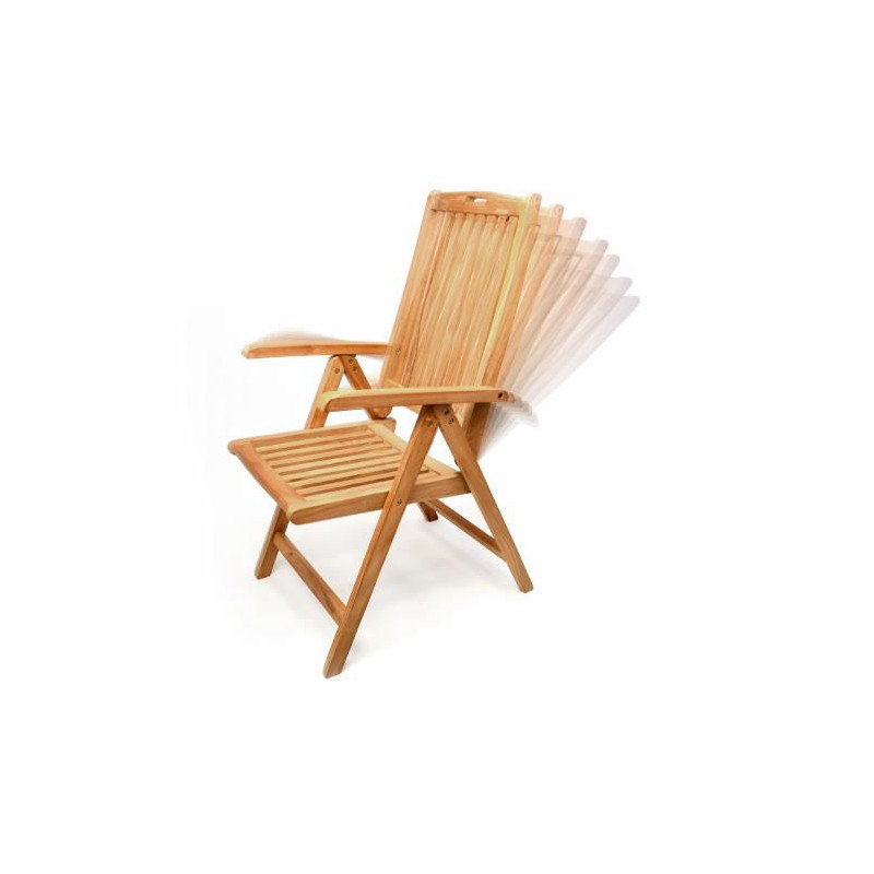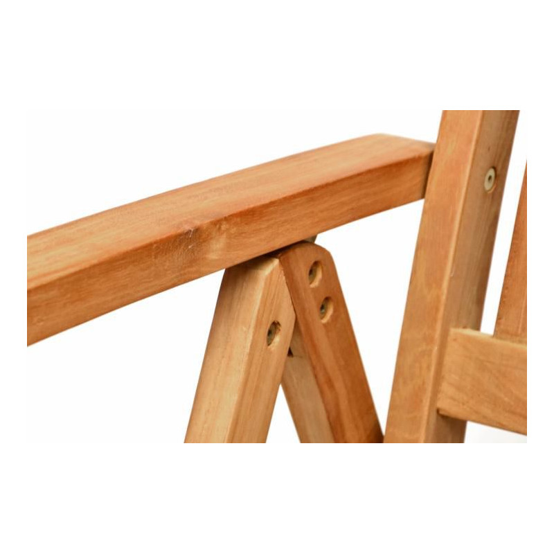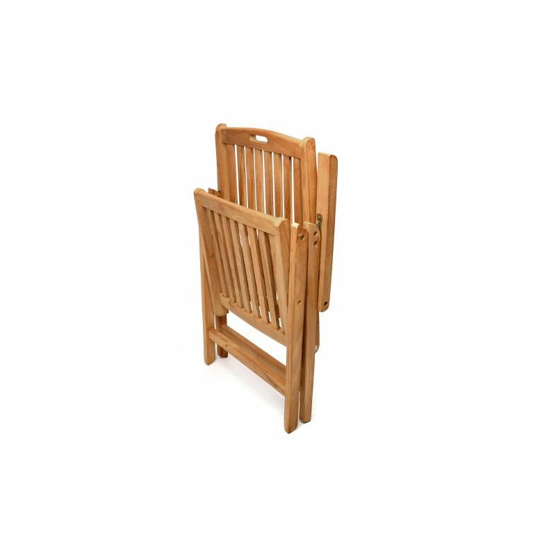 Kvalitná skladacia stolička vyrobená z teakového dreva je ideálna na terasu alebo záhradu. Záhradný nábytok z tohto dreva je vysoko kvalitný a mimoriadne spoľahlivý produkt. Teakové drevo je charakteristické svojím početným žilkovaním a obsahom éterických olejov, ktoré mu zaručujú odolnosť proti vetru a ďalším vplyvom počasia. Teak je pre svoju vynikajúcu odolnosť obľúbený už po stáročia aj v lodnom staviteľstve. Stolička má vysoké operadlo s 5-timi nastaviteľnými stupňami. Stoličky sú skladacie a umožňujú jednoduché uskladnenie